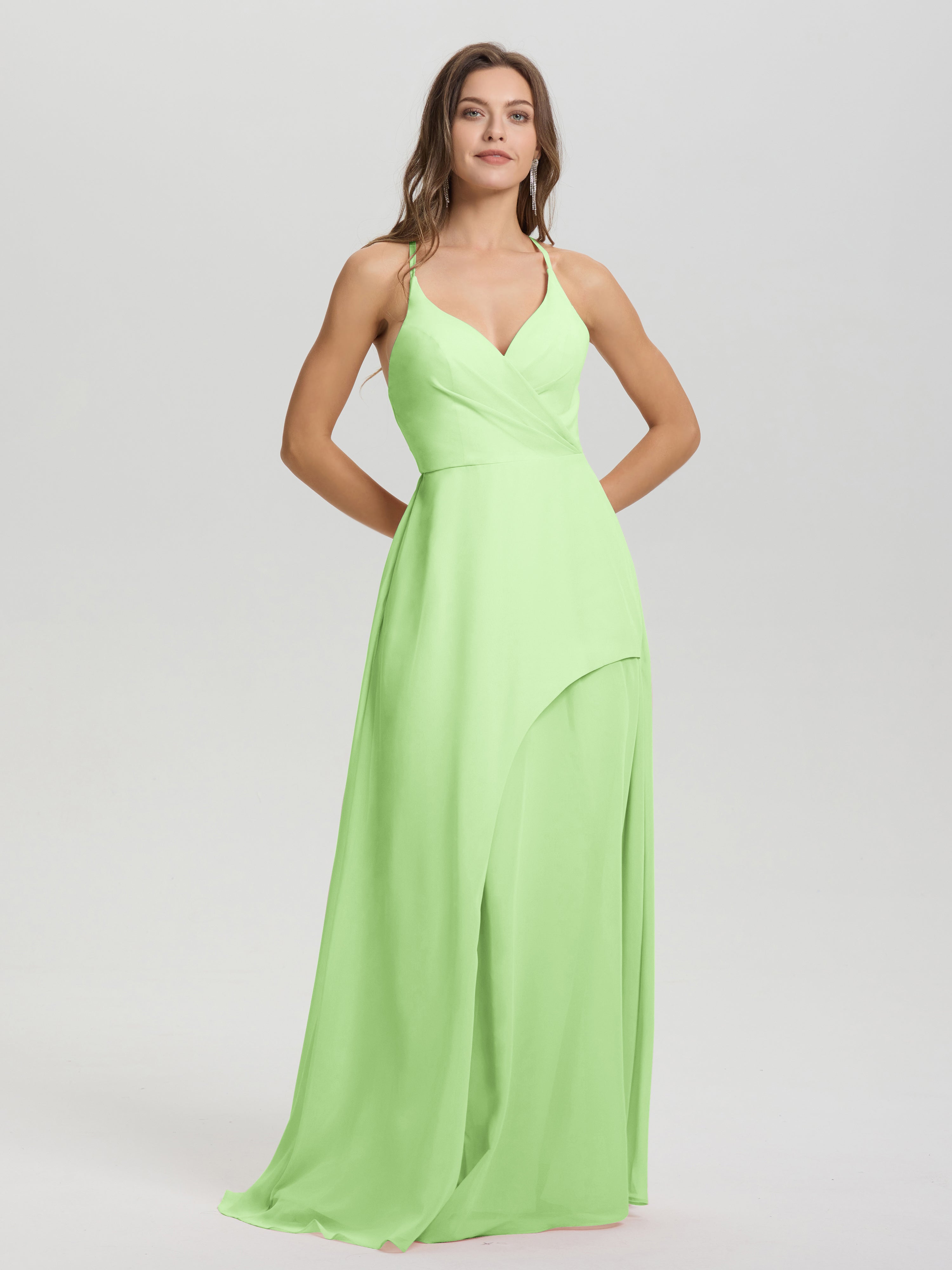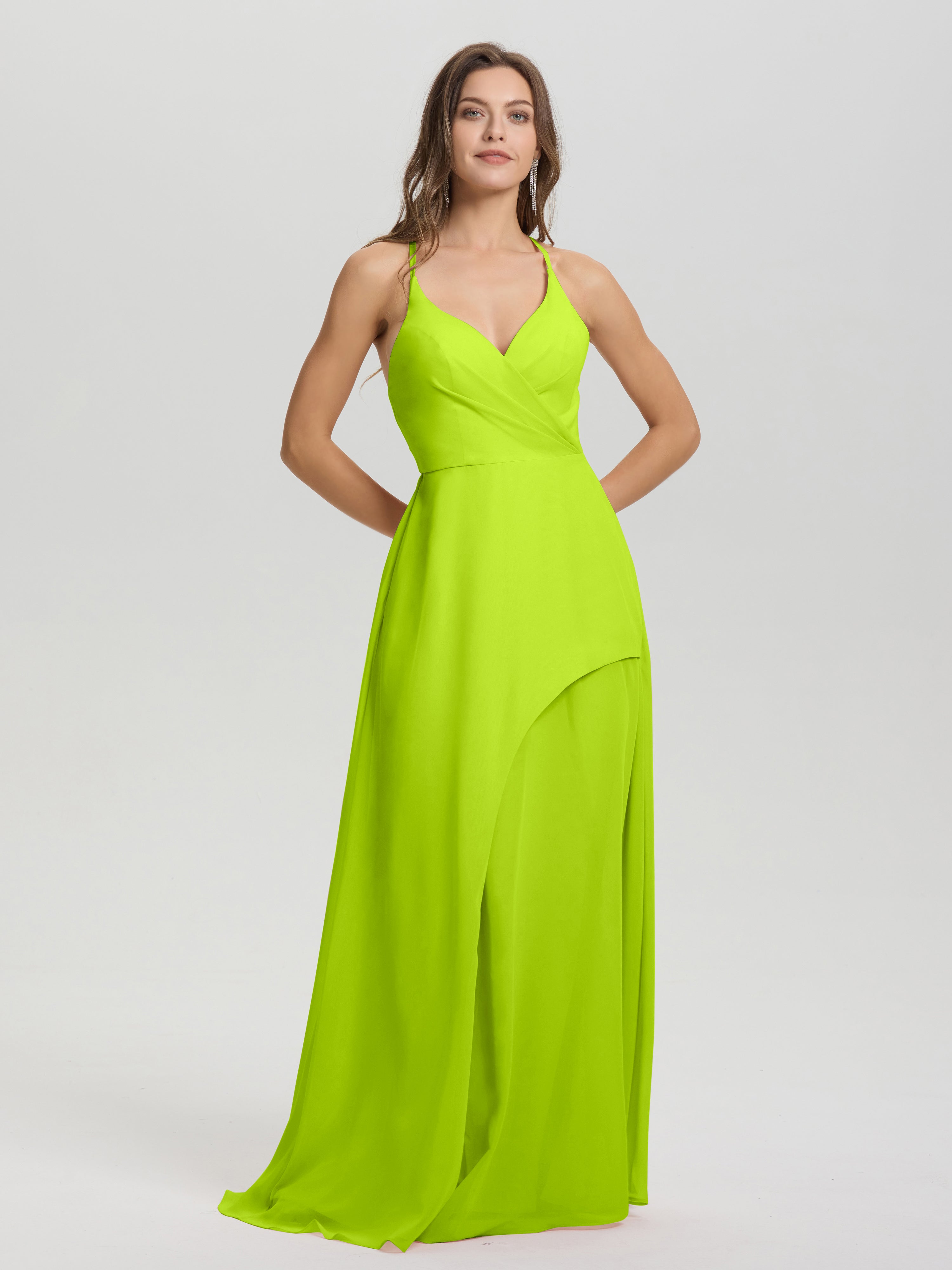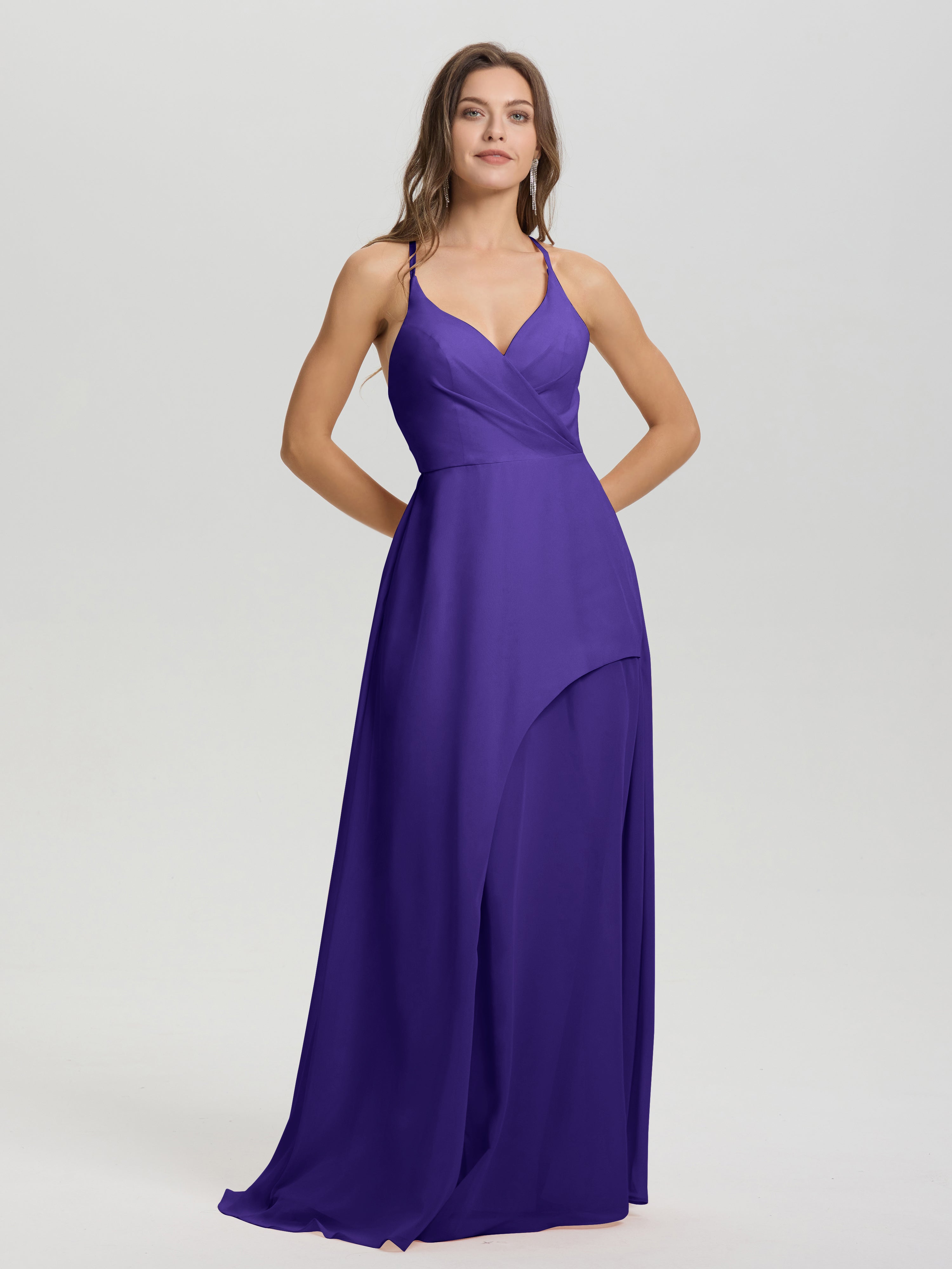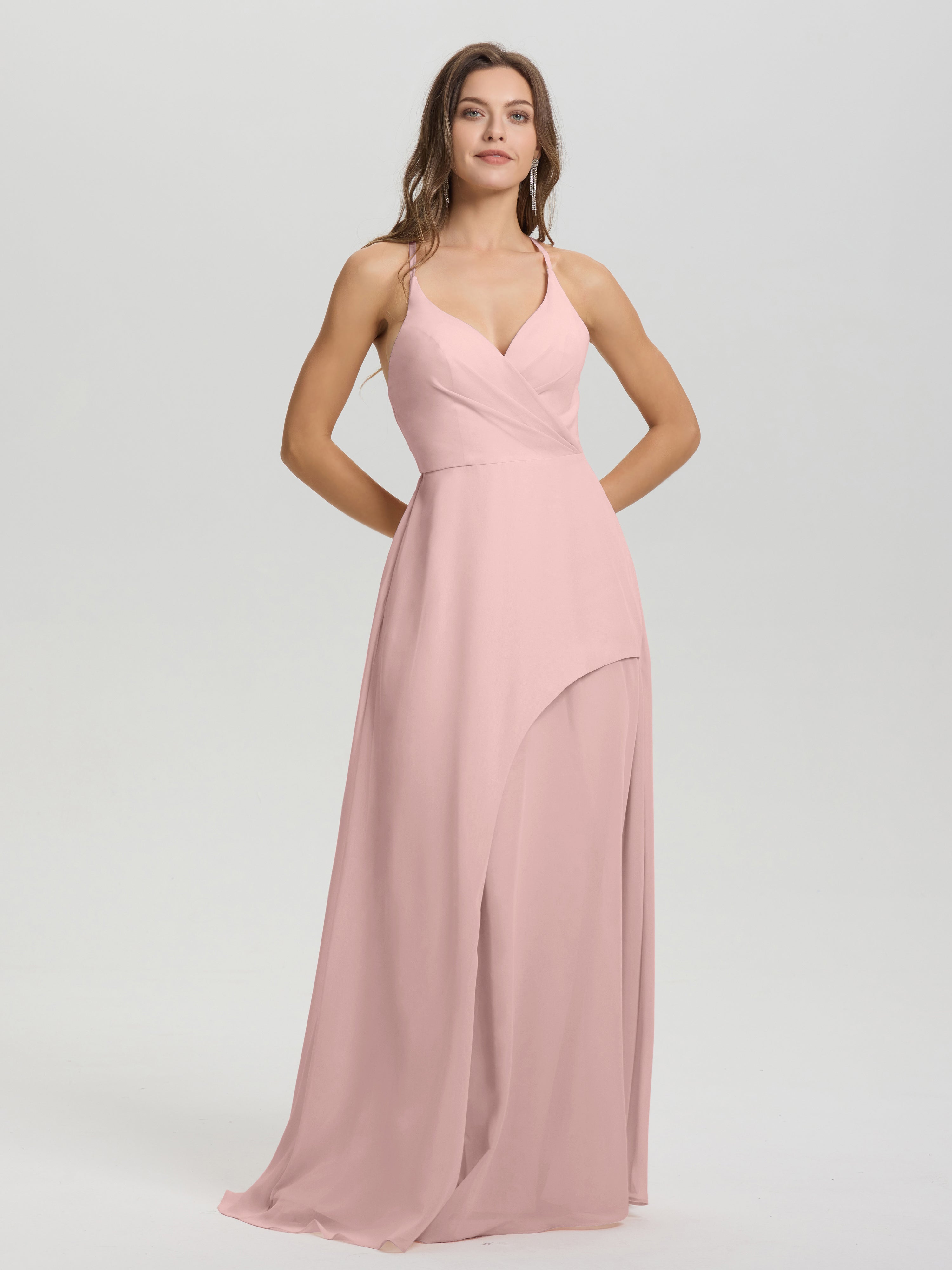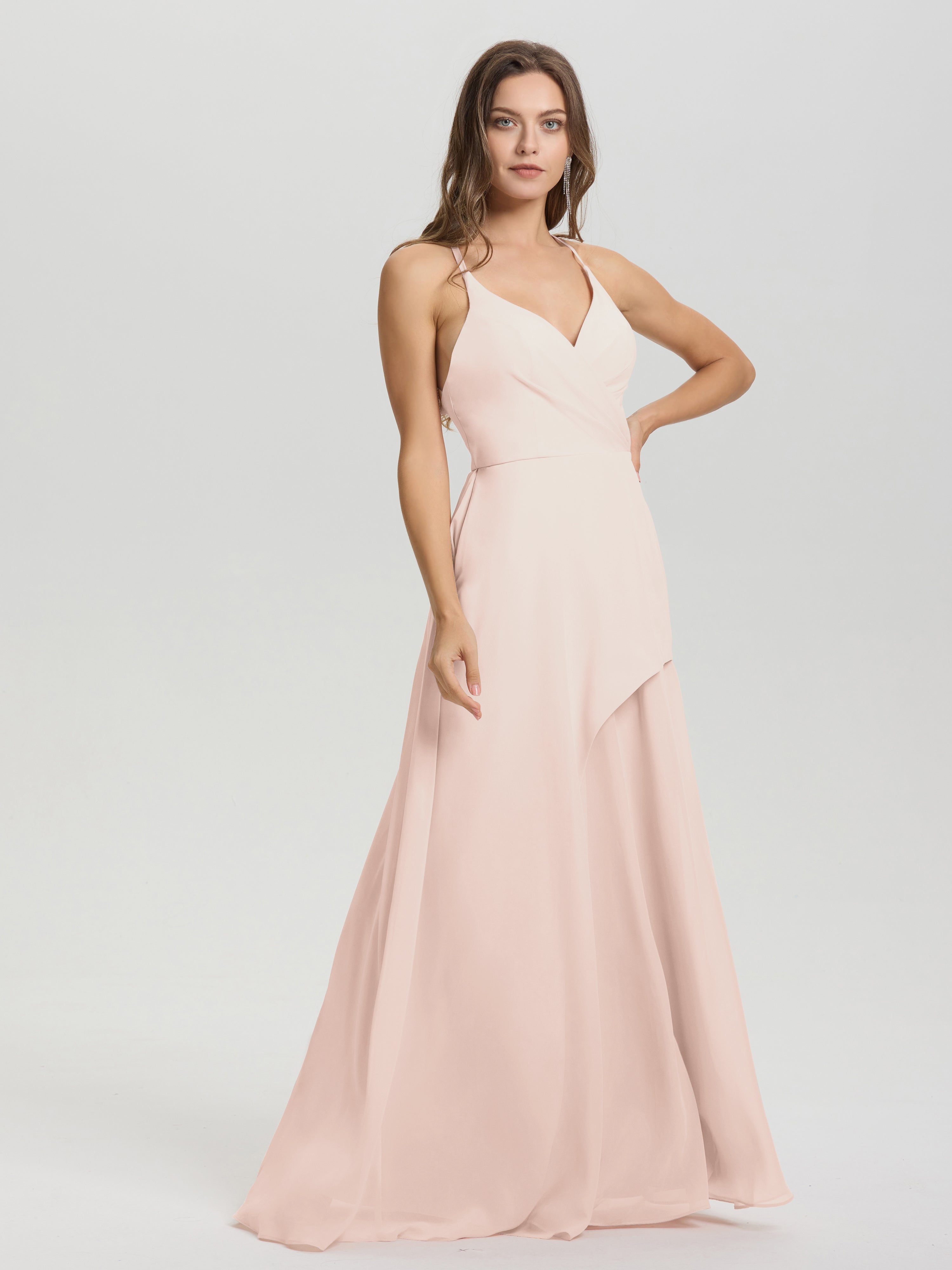 Straps V-Neck Open Back Long Chiffon Formal Bridesmaid Dress