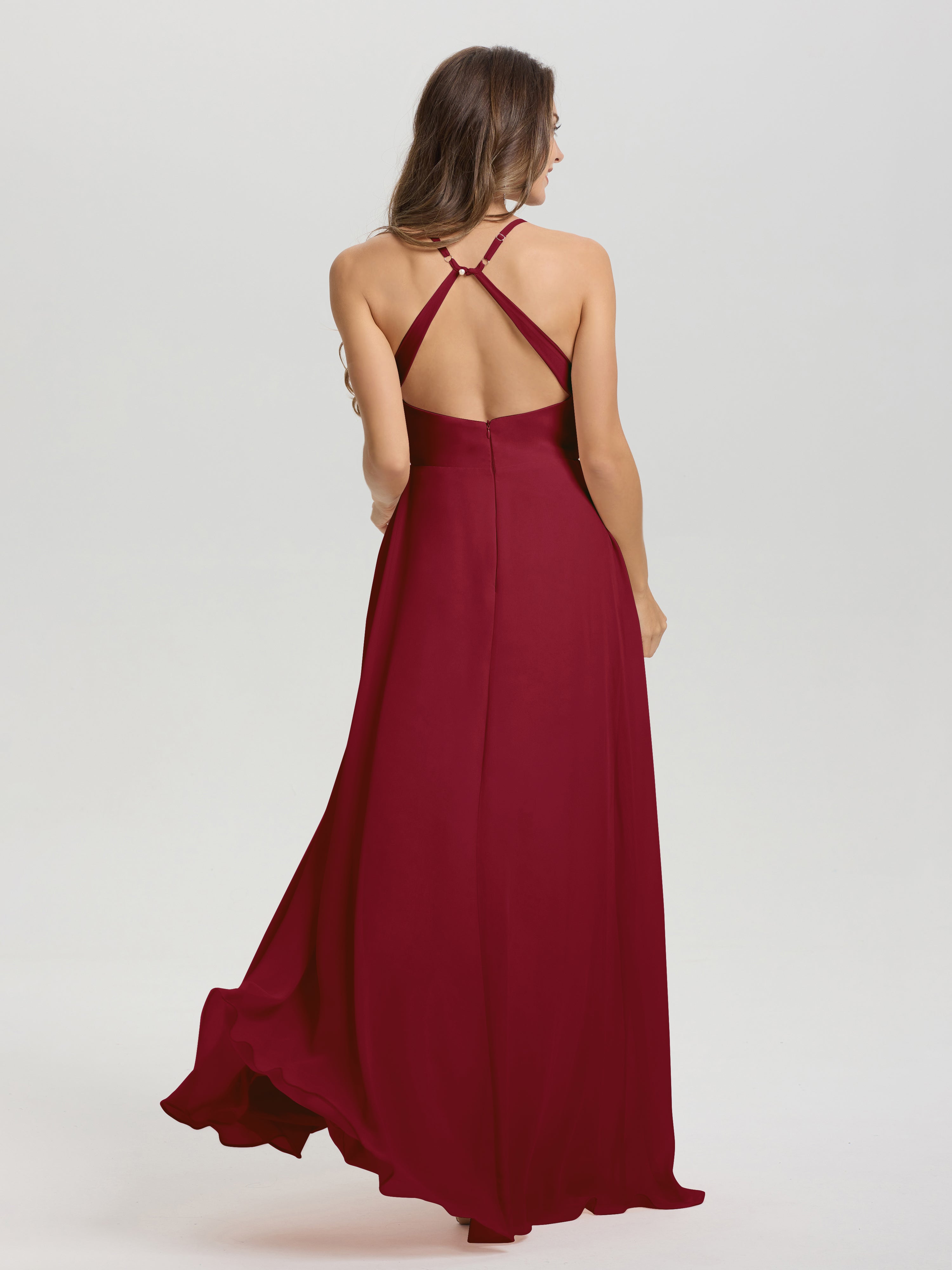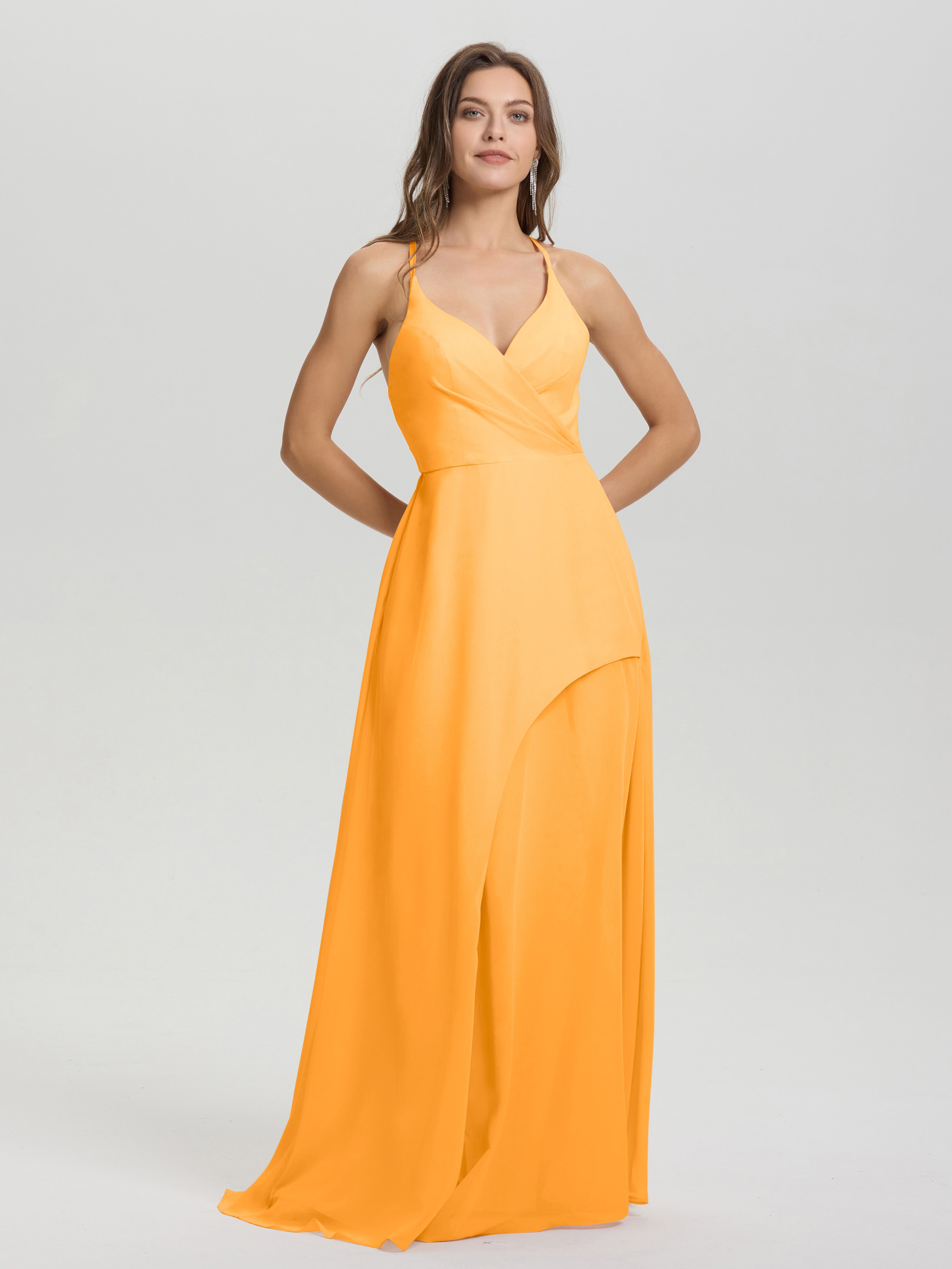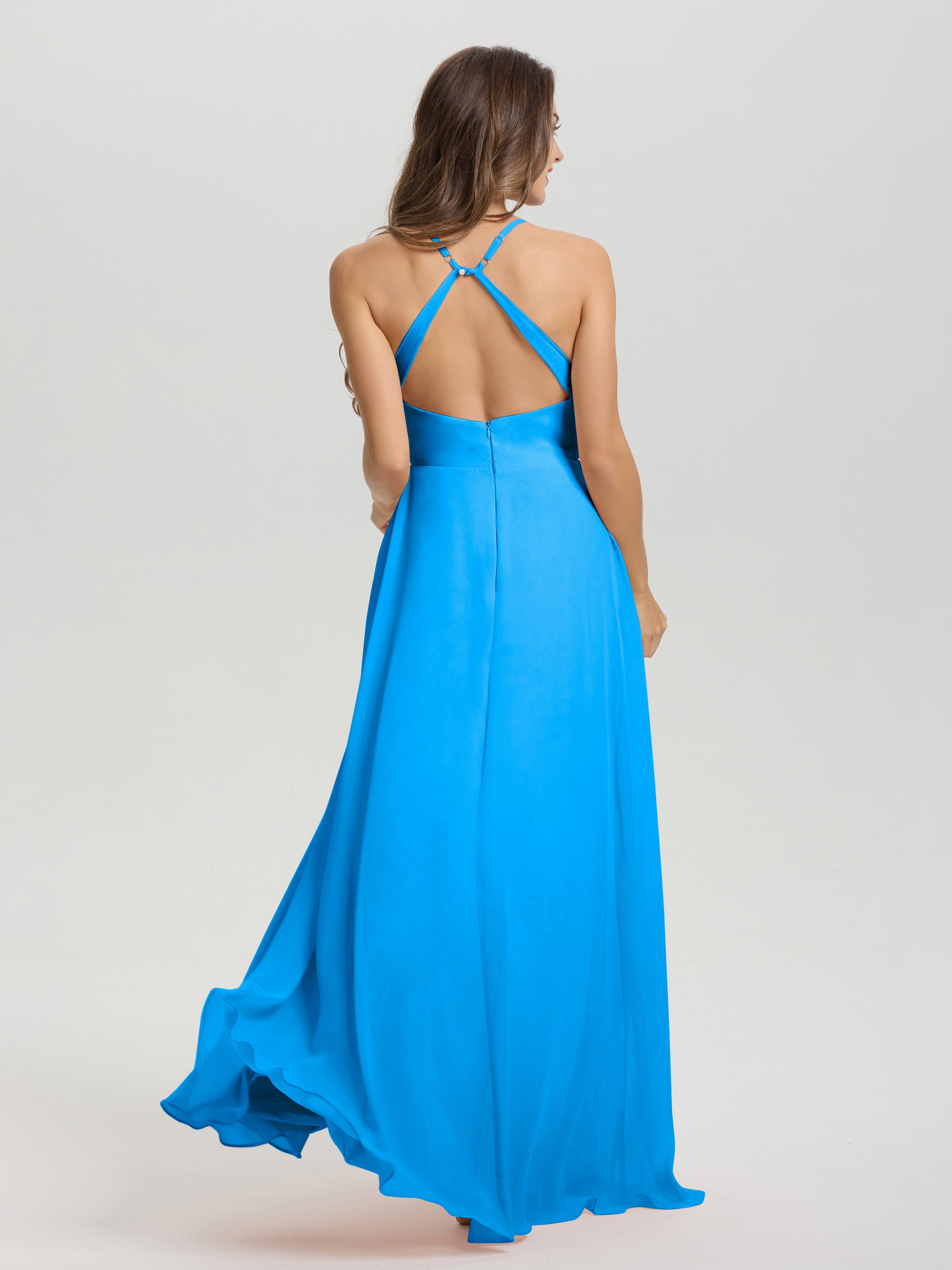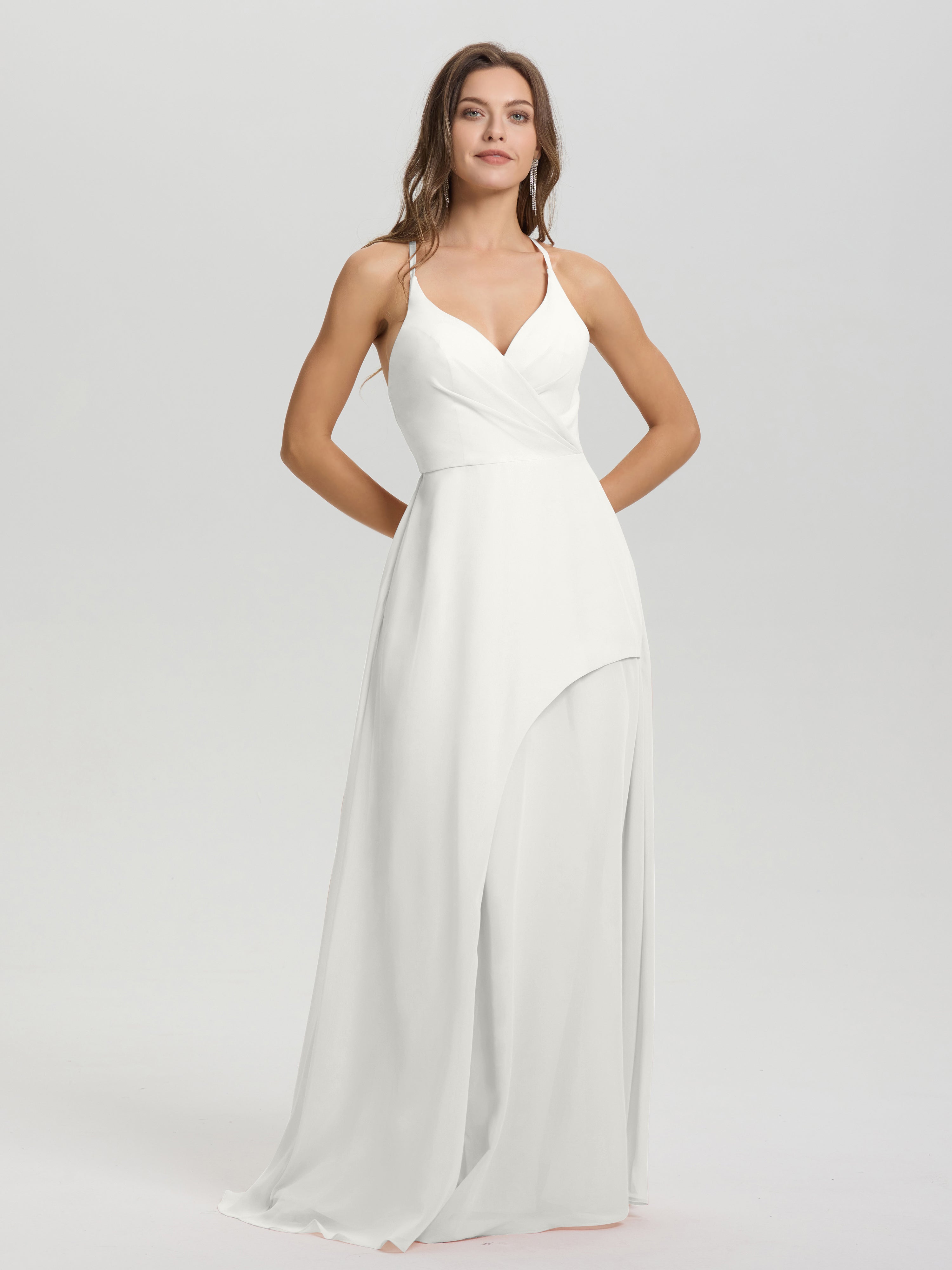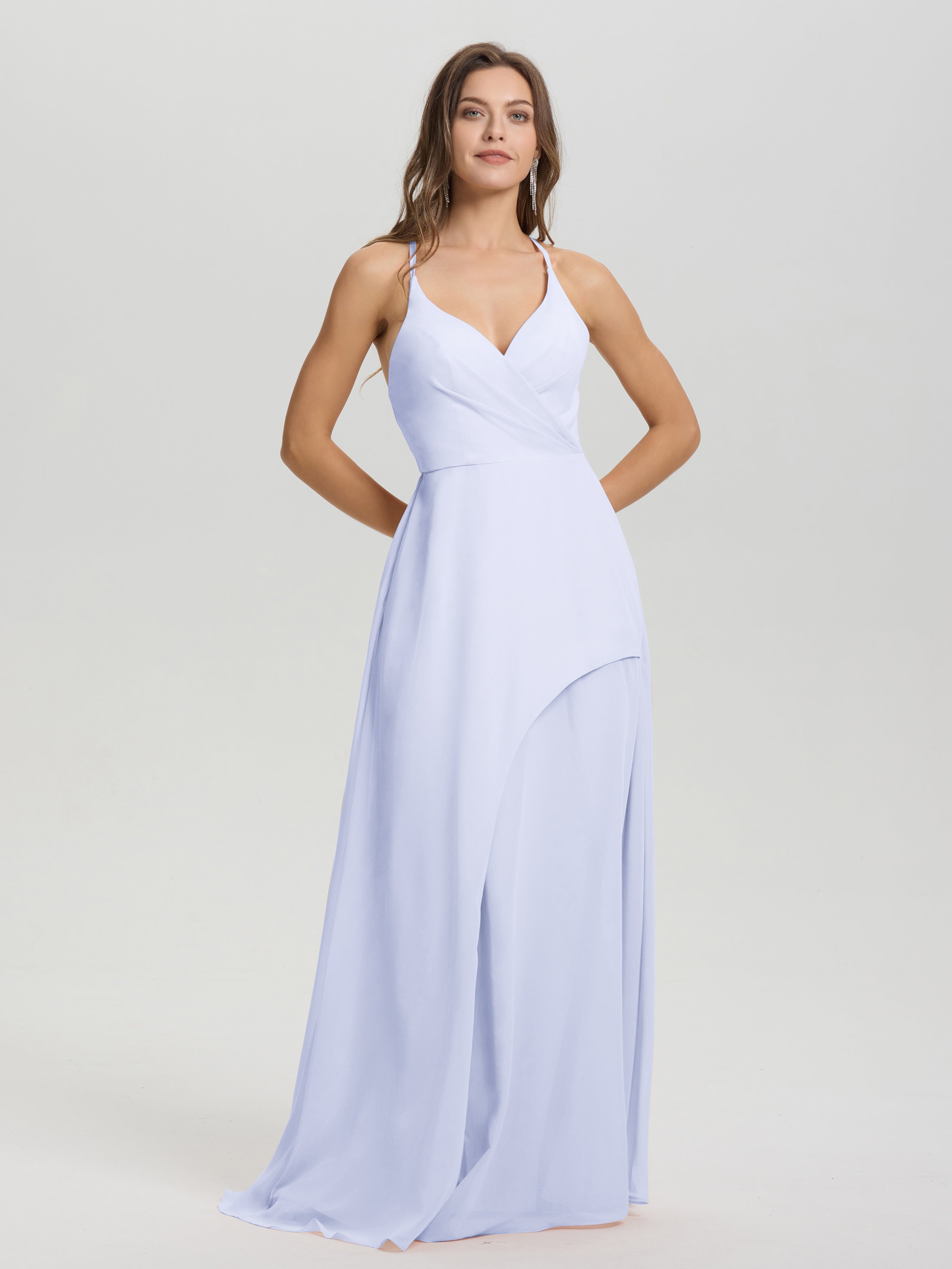 Straps V-Neck Open Back Long Chiffon Formal Bridesmaid Dress
