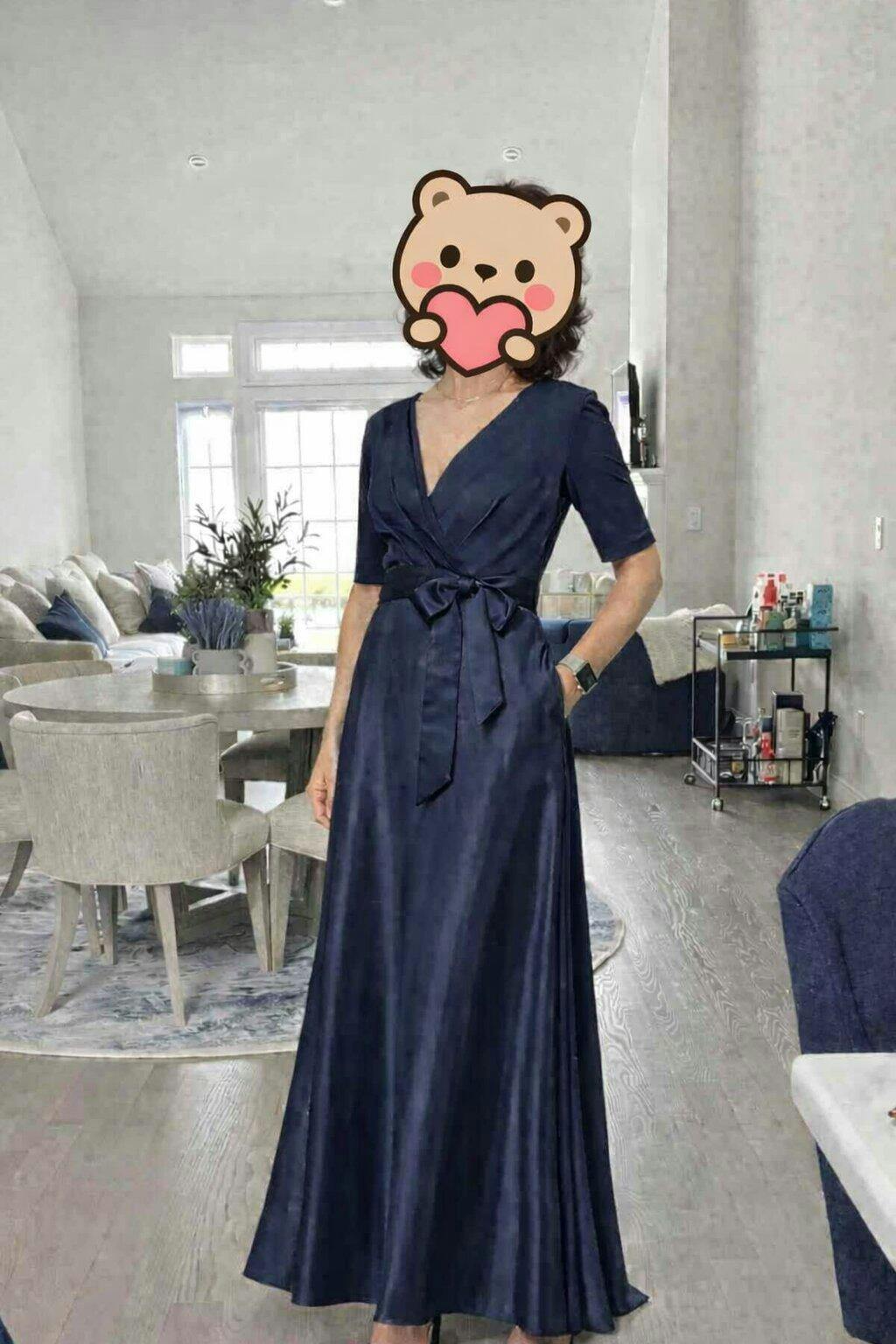 The fabric of this dress is excellent quality—heavyweight and luxurious, with a skirt that drapes beautifully. The length is perfect, just touching the floor for an elegant look. The structured top is both flattering and comfortable, fitting wonderfully at the bust and providing a sophisticated silhouette.