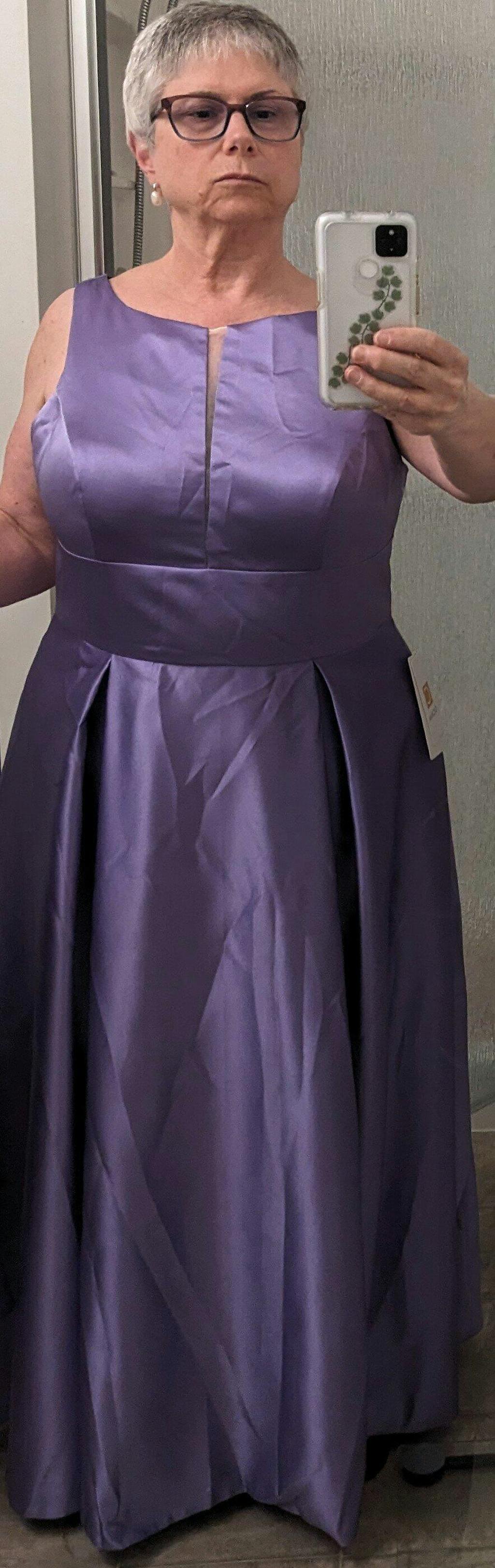 I ordered this dress in "Tahiti" purple as the Mother of the Bride. The color works well with my gray hair. I also ordered a swatch of the same color chiffon, and it's a very good match in case you want a shawl or cape, although I wound up using a chiffon jacket I already had in Regency purple, which coordinates well and covers my old arms. I'm between sizes and short, so I used the Custom option which didn't cost any more! The dress has pockets, perfect to hide my cellphone. It's fully lined, well-sewn, has a built-in bra and strategic boning to keep the waist smooth, and has illusion fabric in the slit neckline. It arrived more quickly than I expected and just needs a bit of steam to get the shipping wrinkles out. The picture is straight out of the pouch.