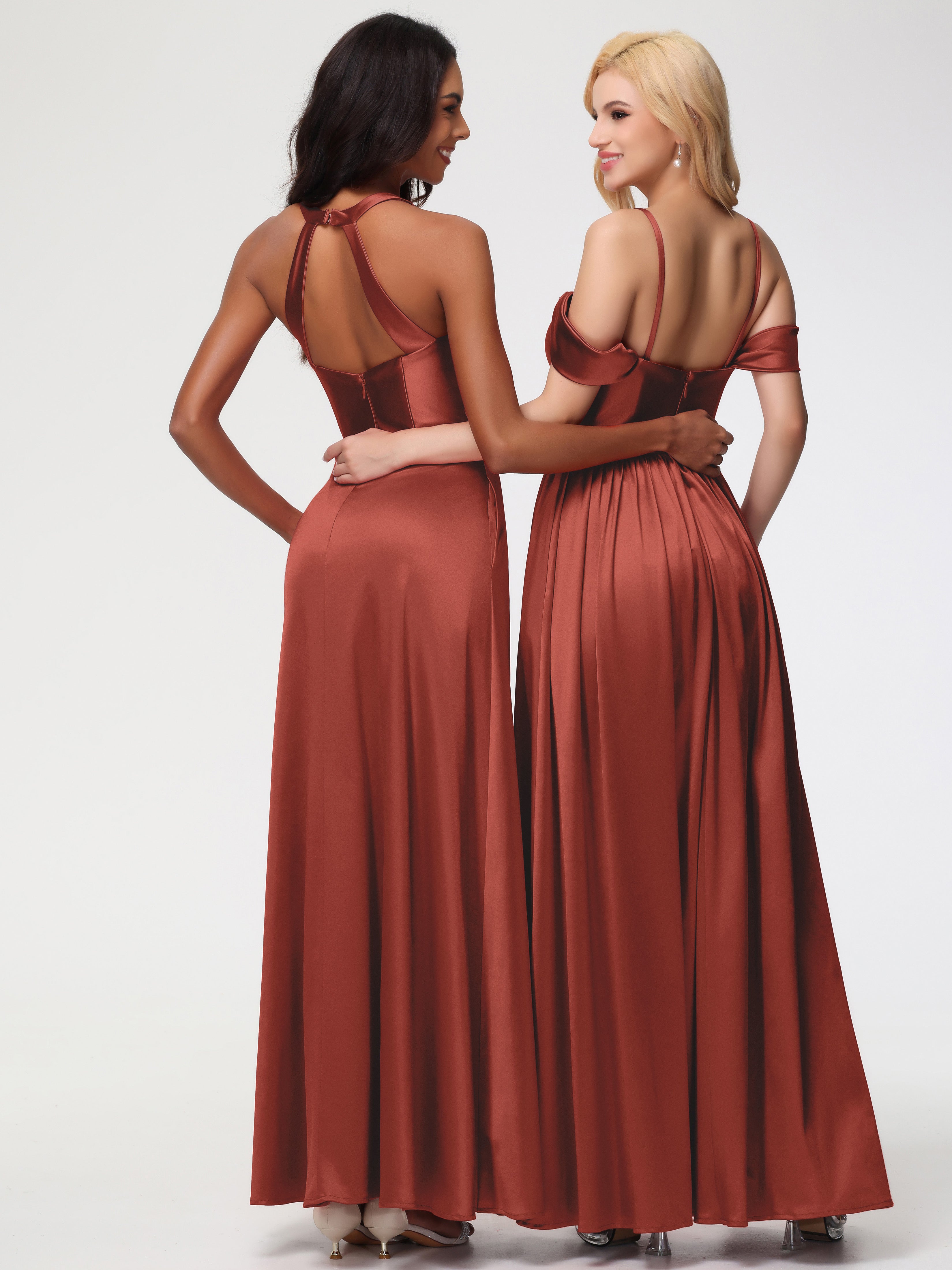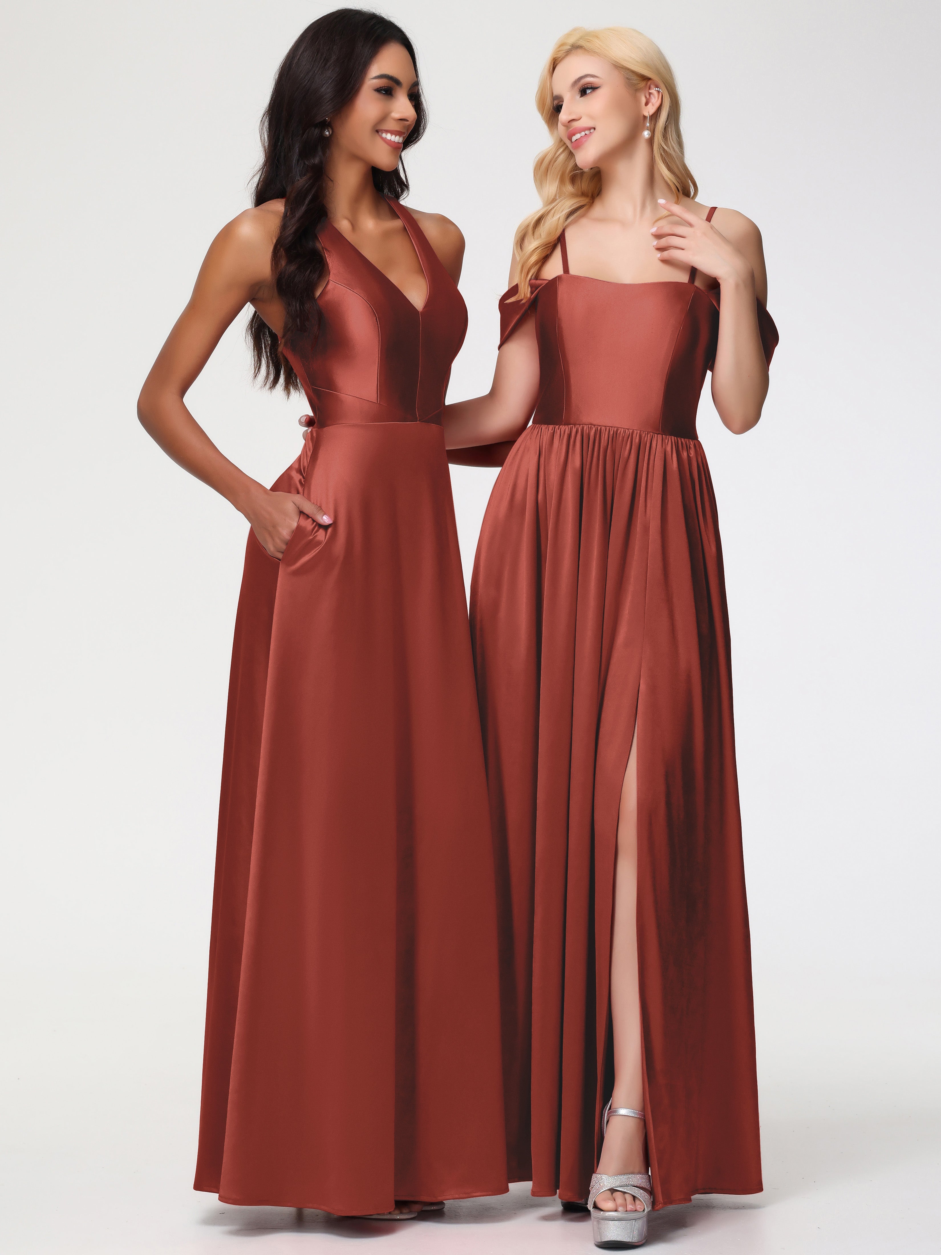 Rust Bridesmaids Dress Elegant V-Neck A Line Slit Stretch Satin Long Bridesmaid Dress