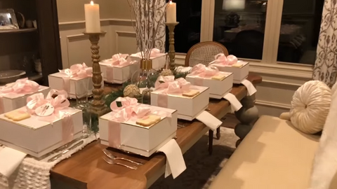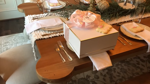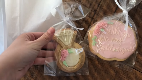 Every girl has their box, their cookies and ribbon ornaments. On the back of the ornaments it says bridesmaid their name and then our wedding date. I'm gonna try to show you what's inside the boxes. Each girl gets a set of pajamas because we're having a sleepover tonight. A flute with their name on it and the ornament the same as outside the box and the cookies. It is like two hours until they get here, the excited digits.