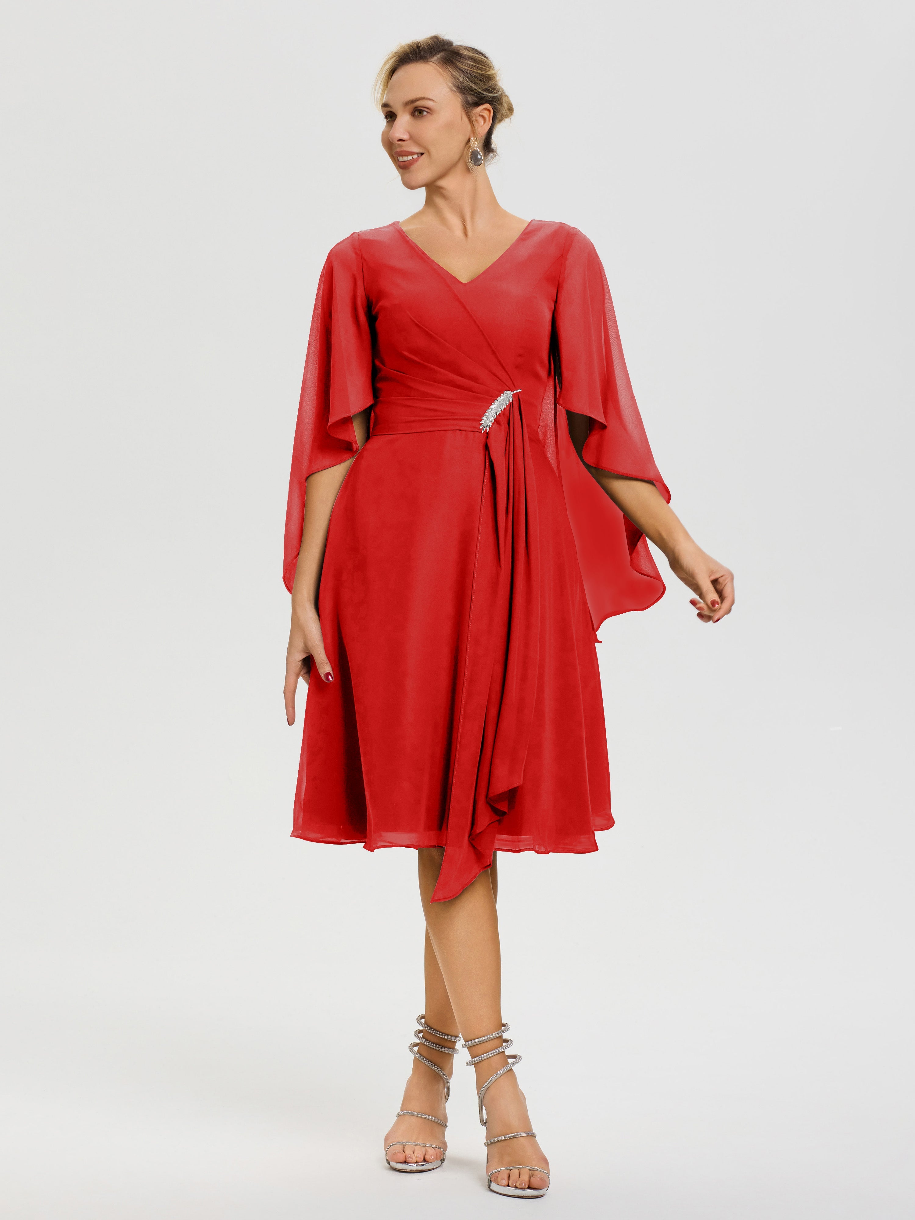 Red Mother Of The Bride Dresses Elegant V Neck Ruffle Sleeves Back Zip Knee Length Mother Of The Bride Dresses