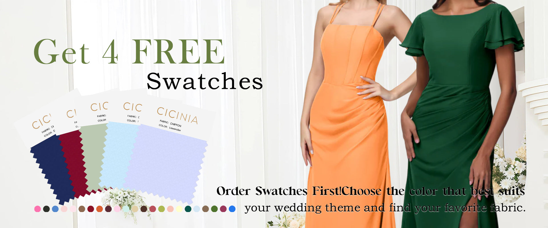 Order Swatches First. Choose the color that best suits your wedding theme and find your favorite fabric.