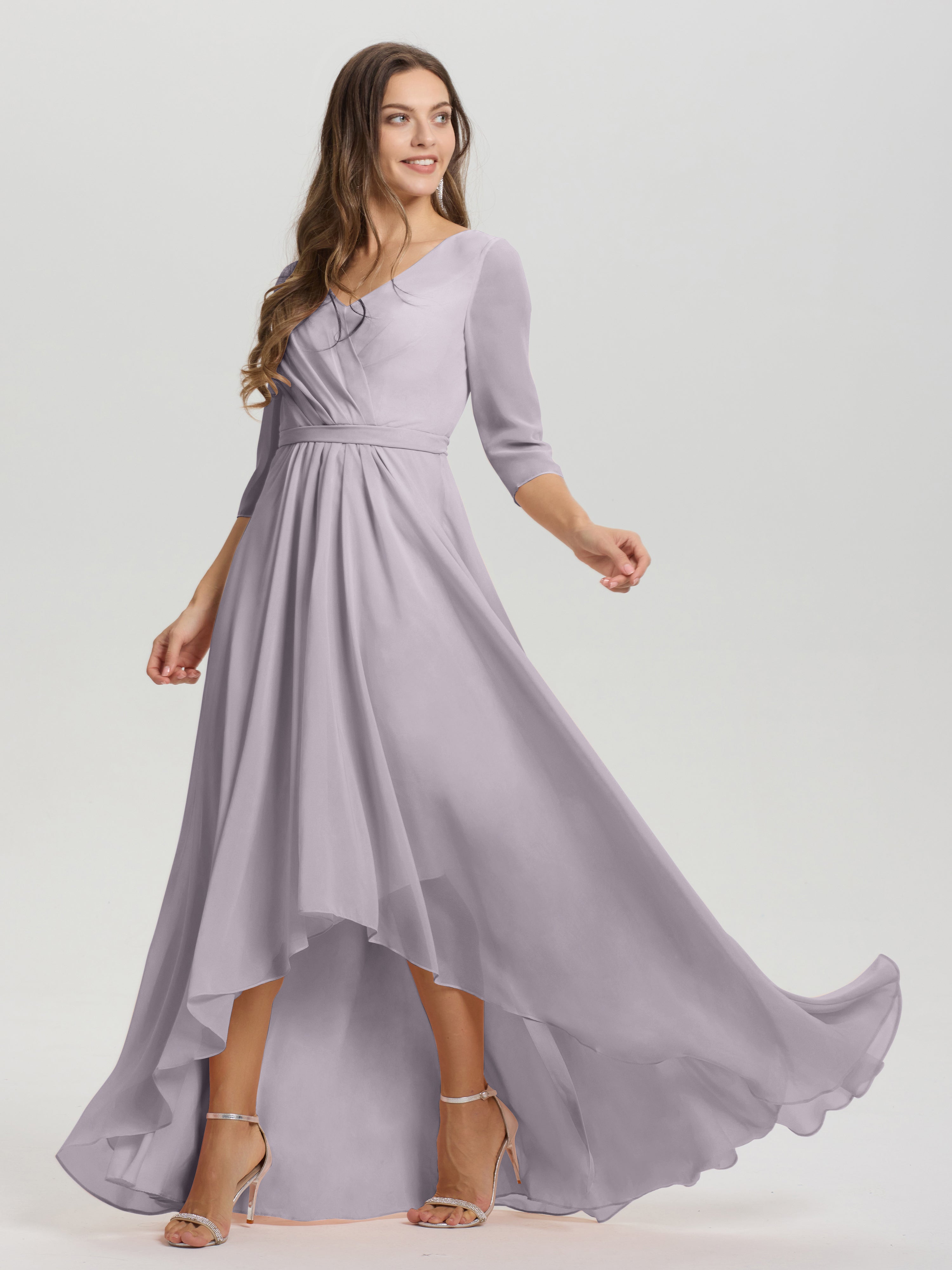 Flowy 3/4 Sleeves V-Neck Asymmetrical High Low Chiffon Bridesmaid Dress