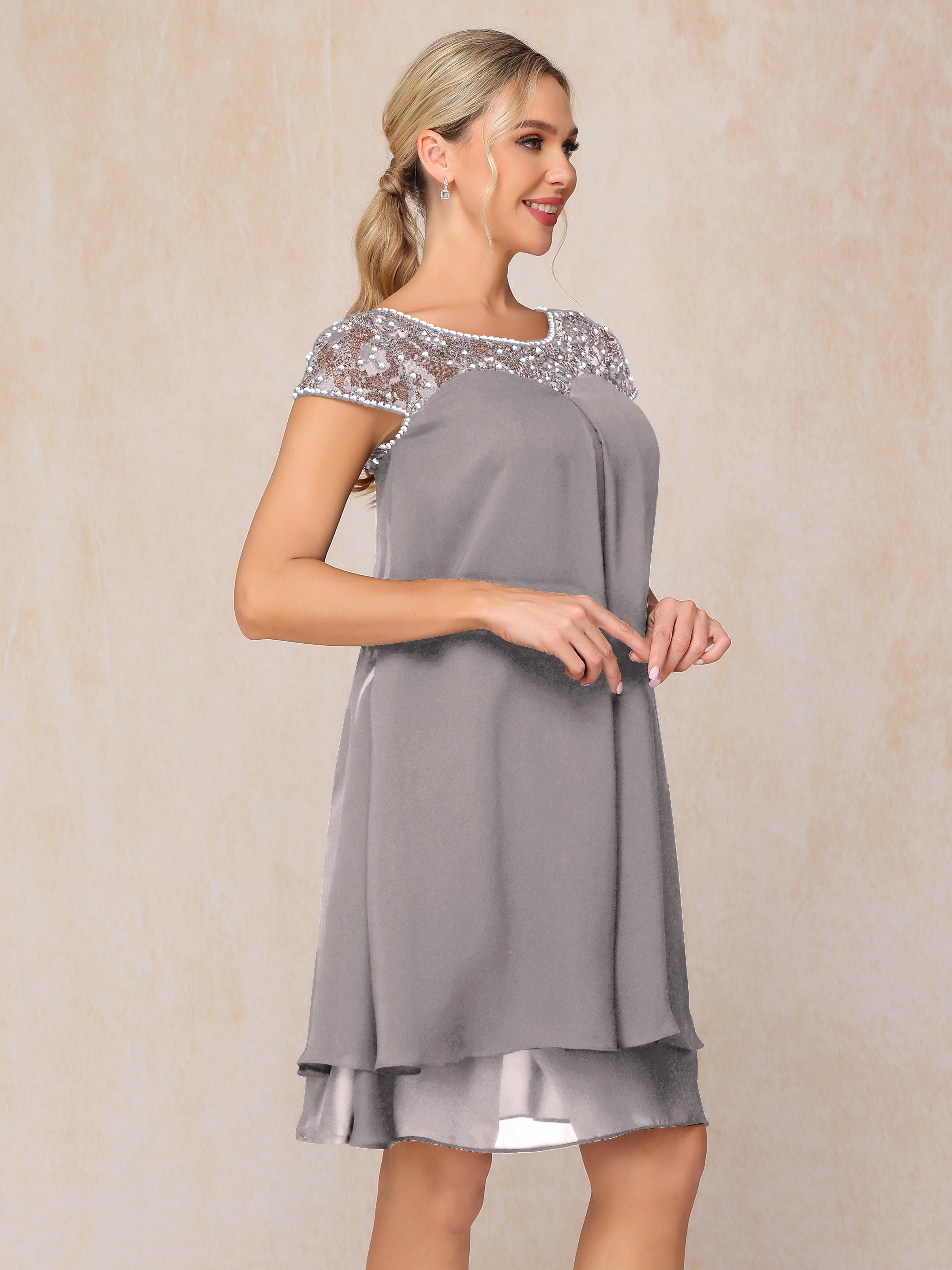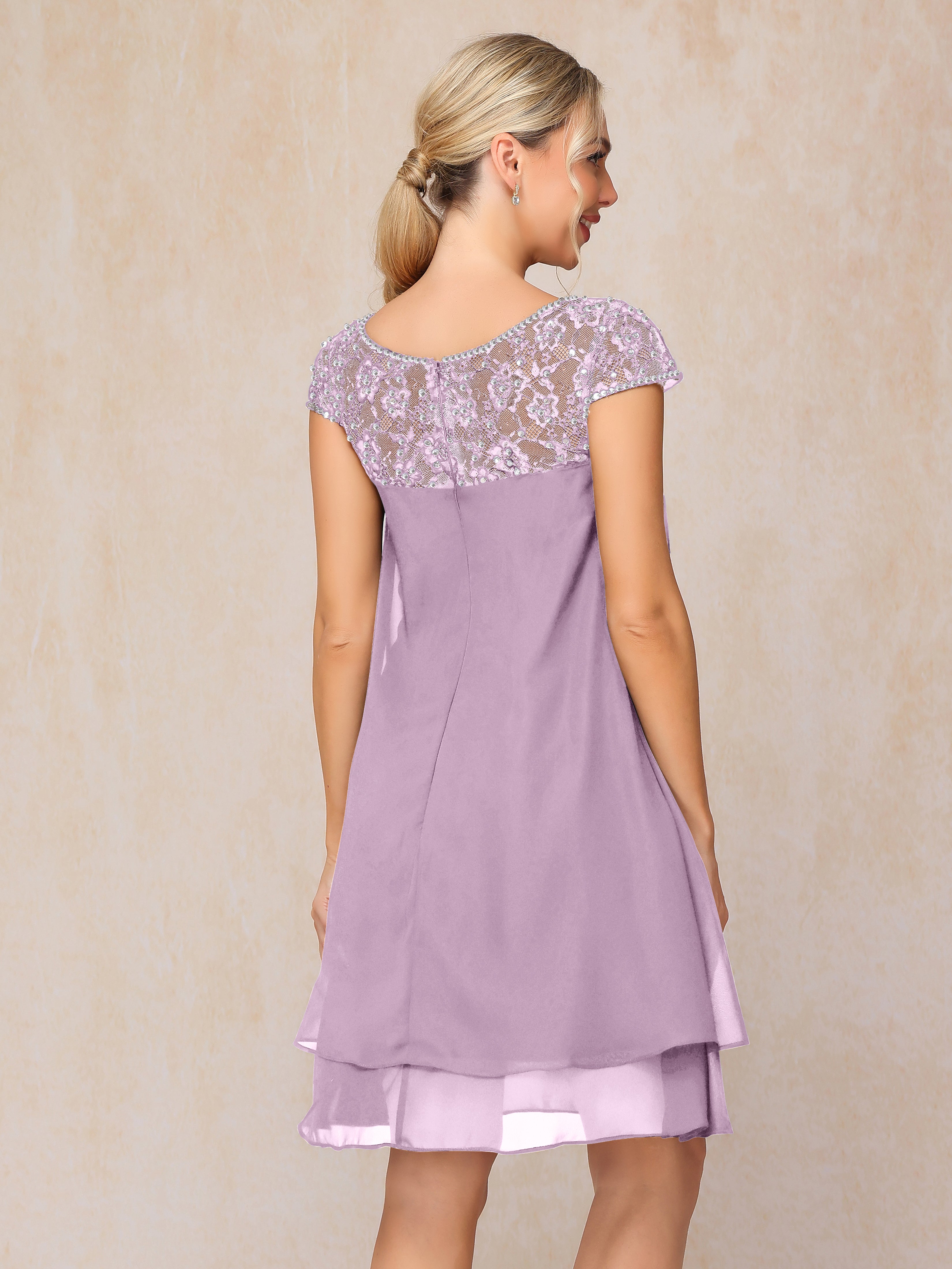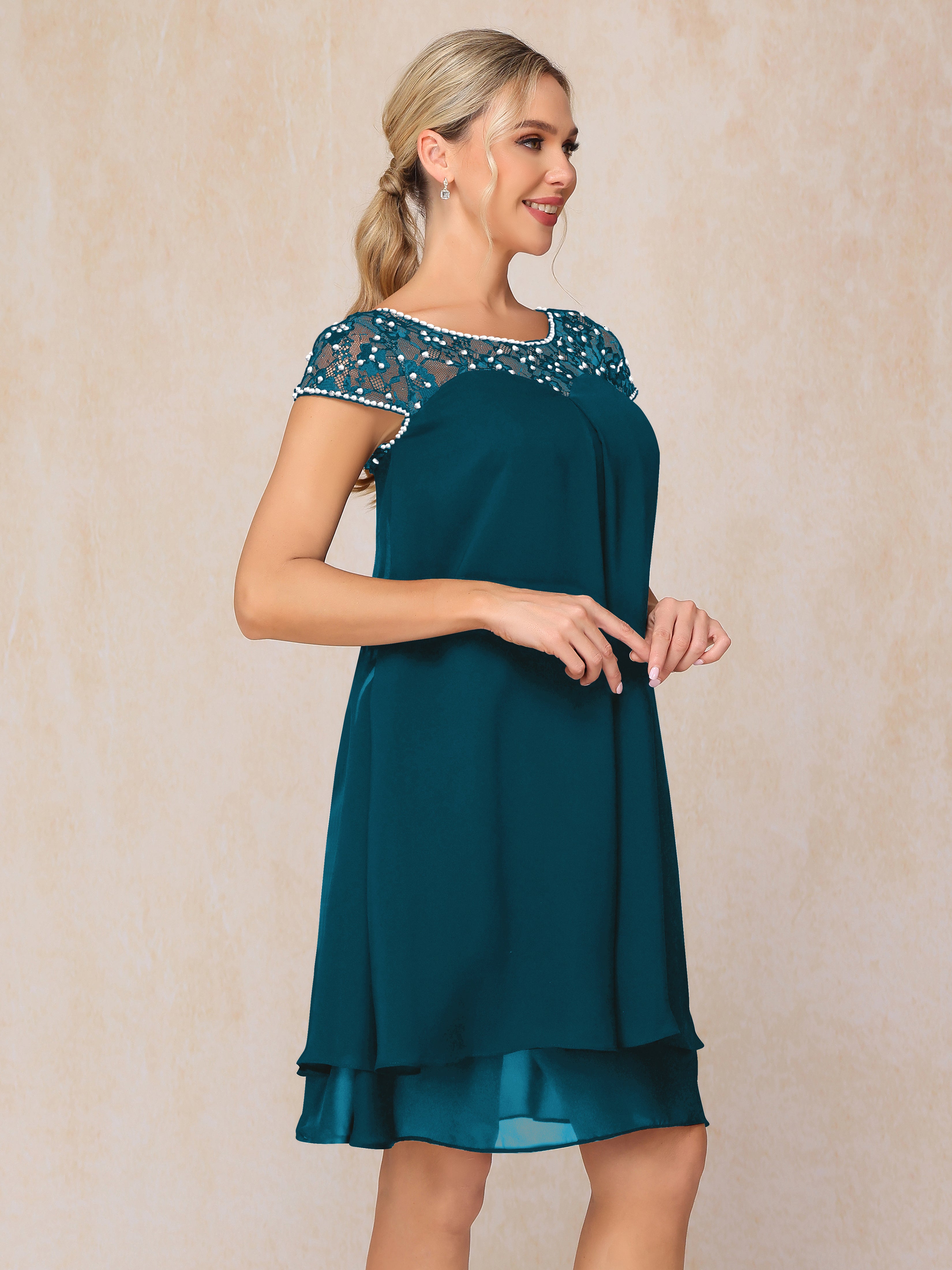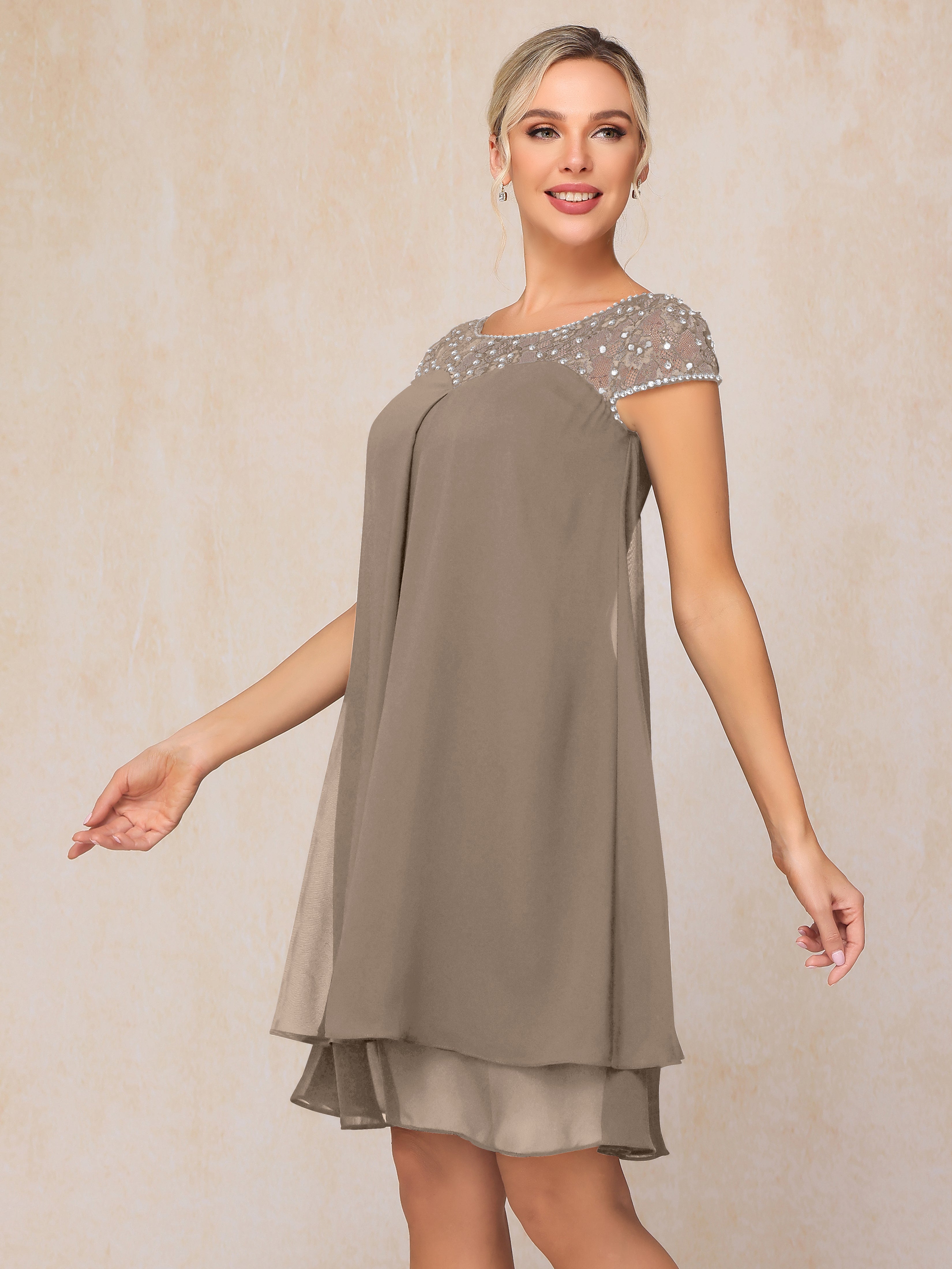 Cap Sleeves Beading Knee Length Chiffon Lace Mother Of The Bride Dress