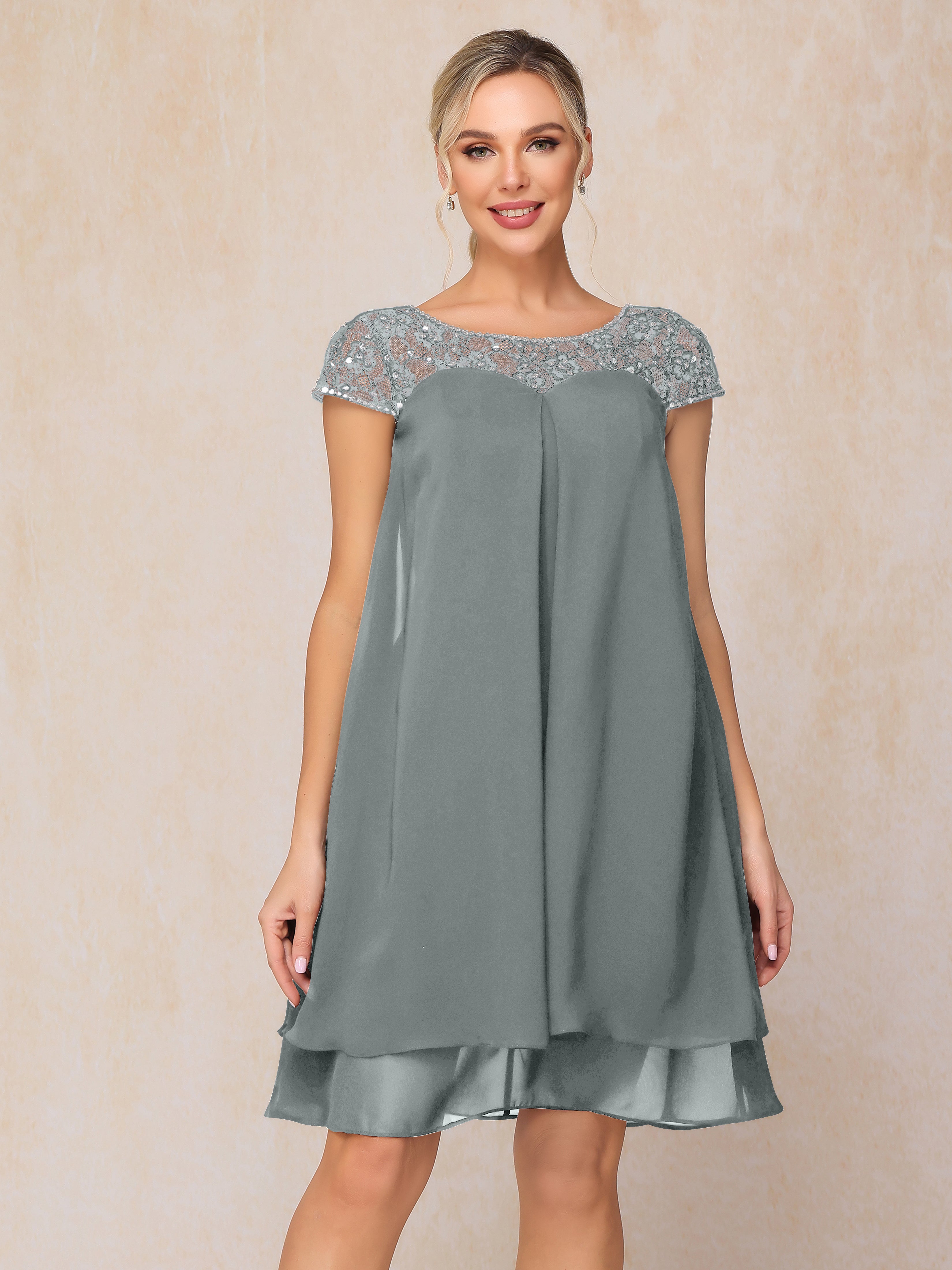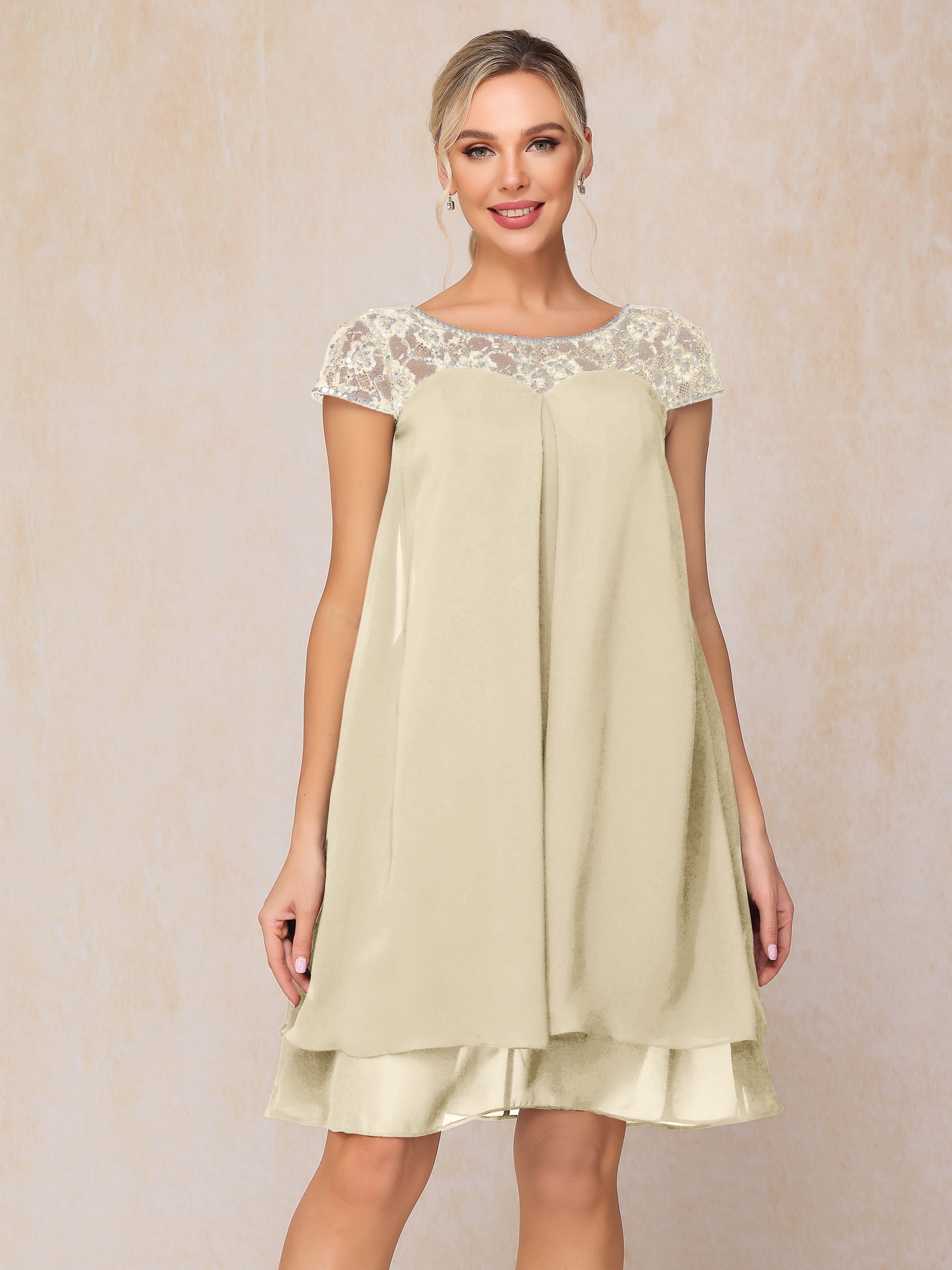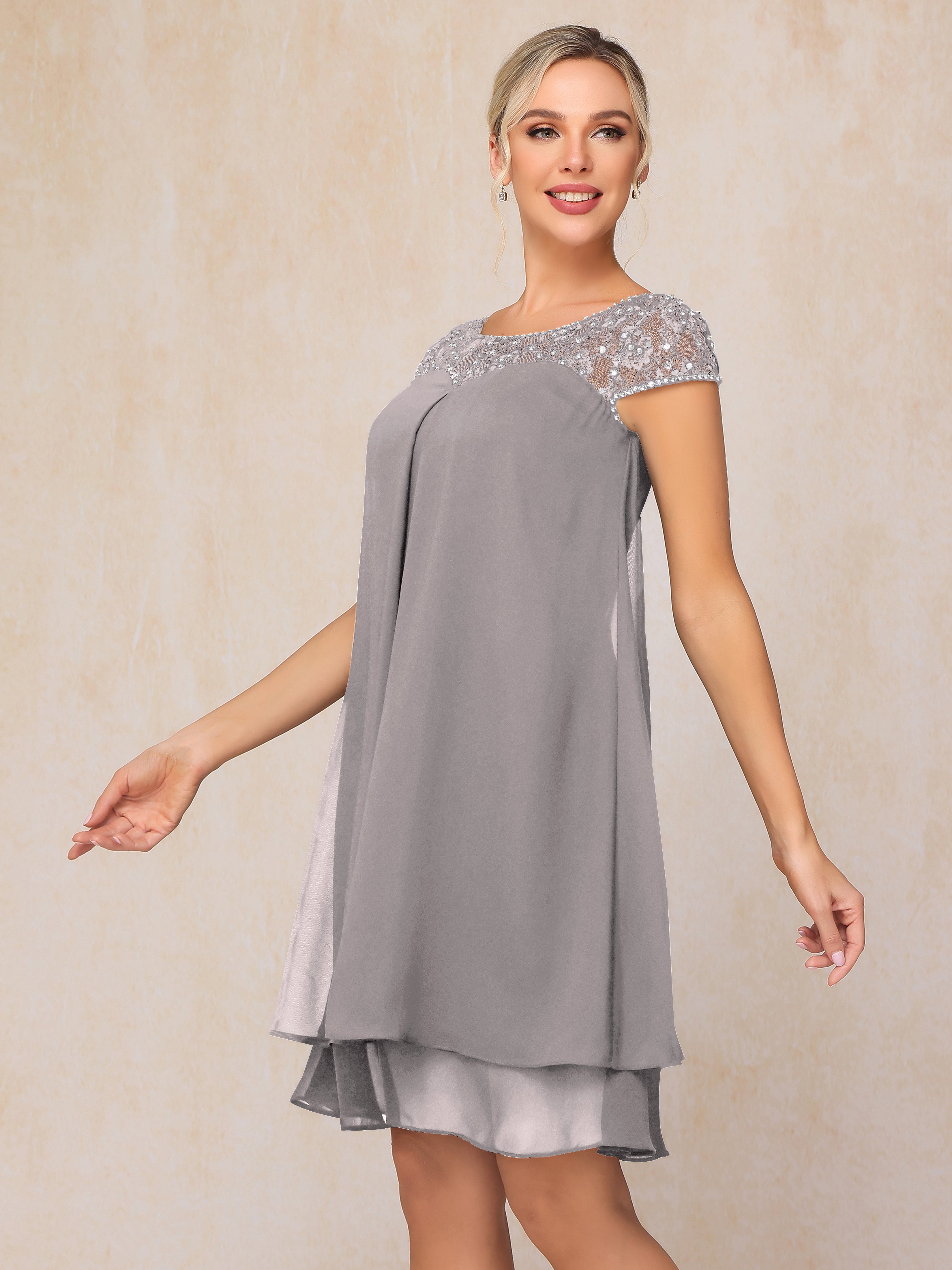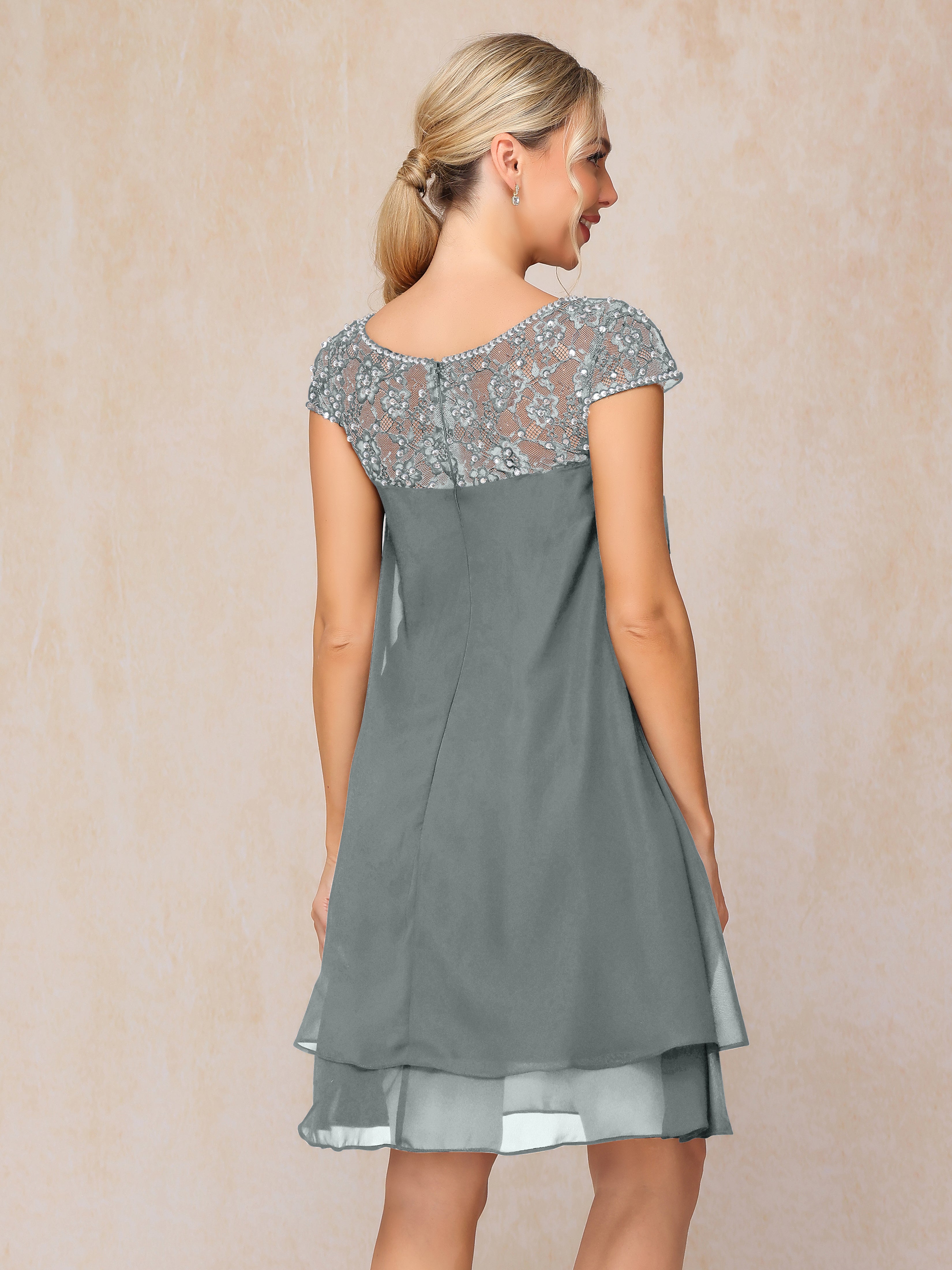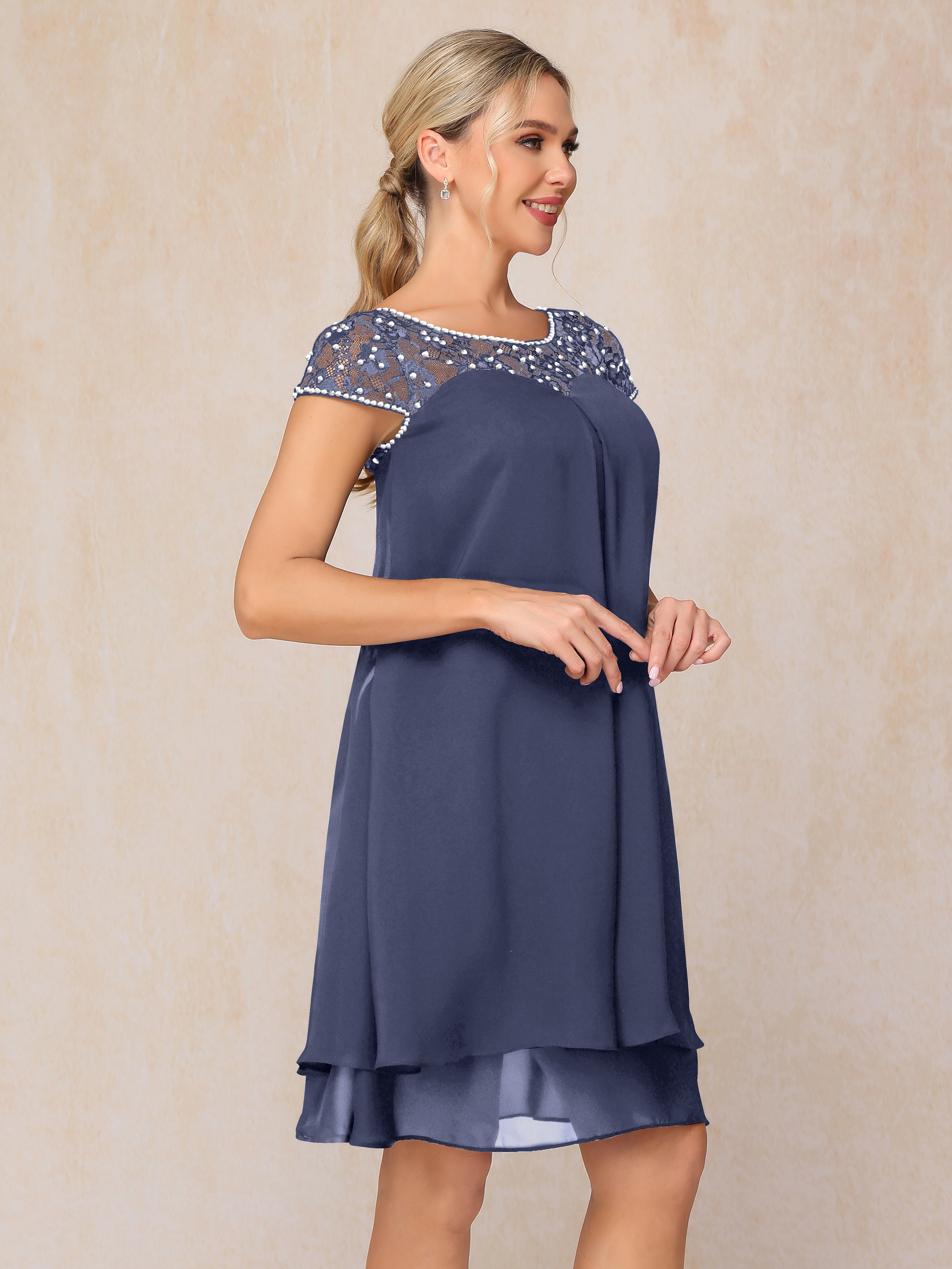 Cap Sleeves Beading Knee Length Chiffon Lace Mother Of The Bride Dress