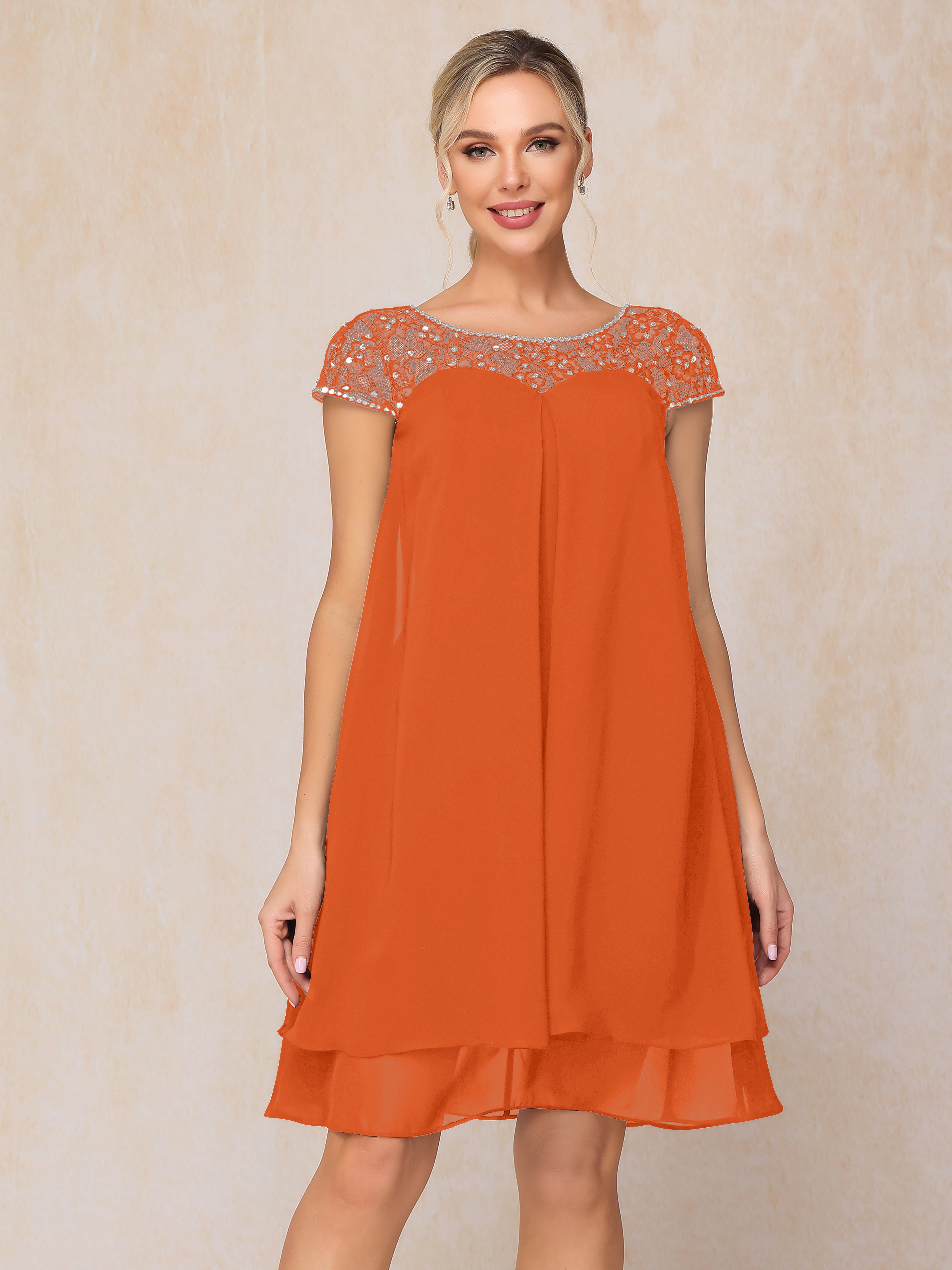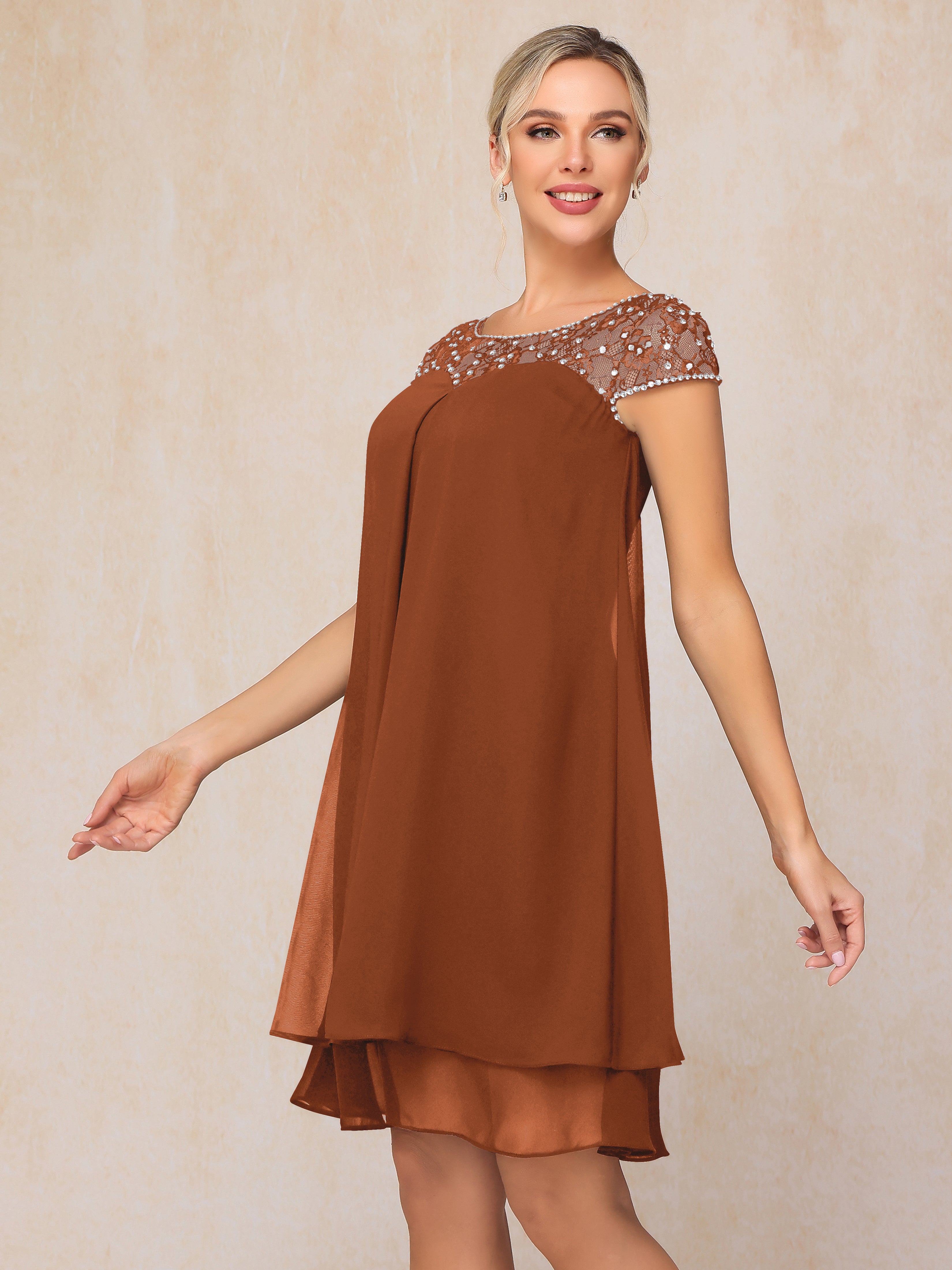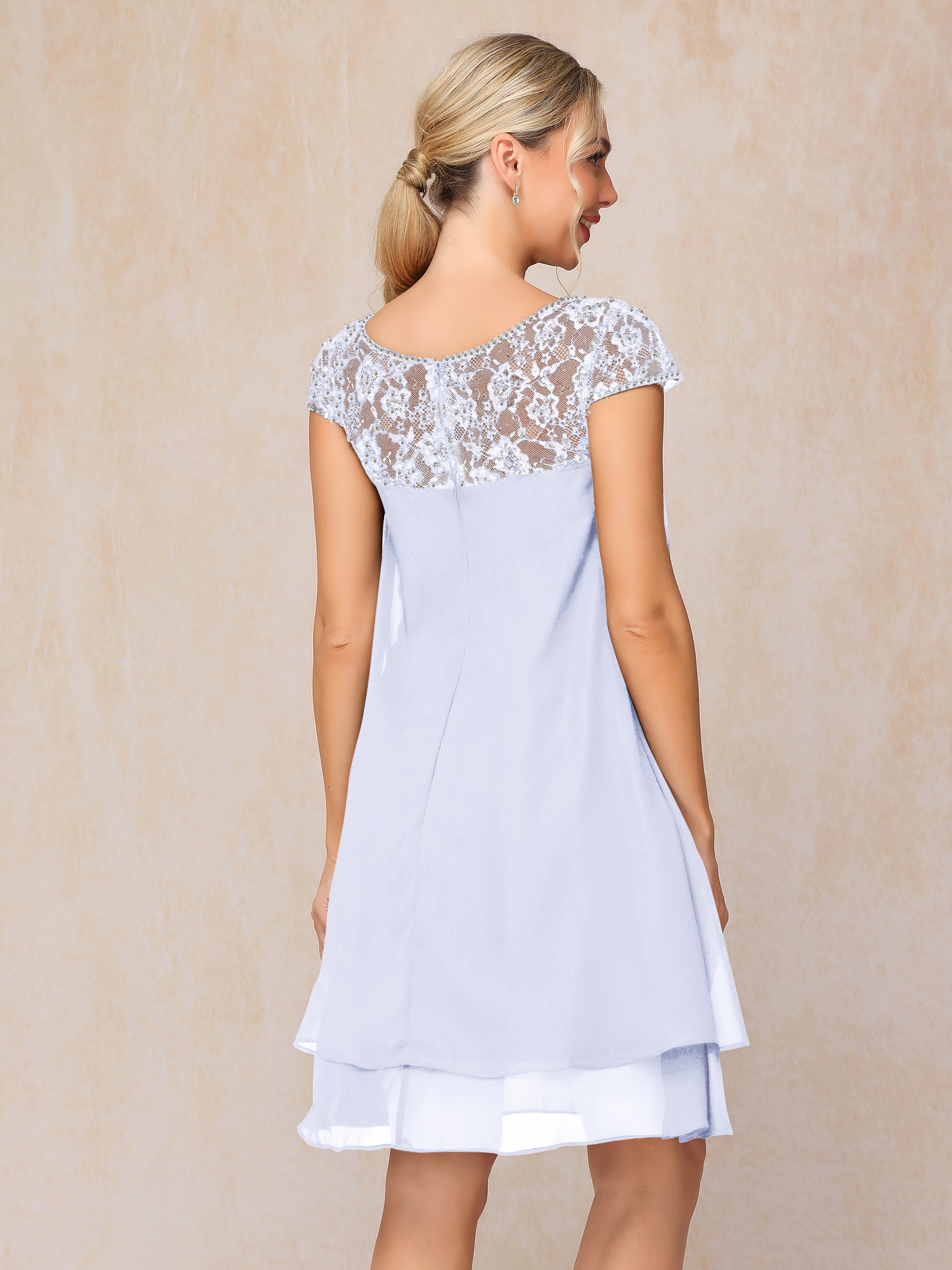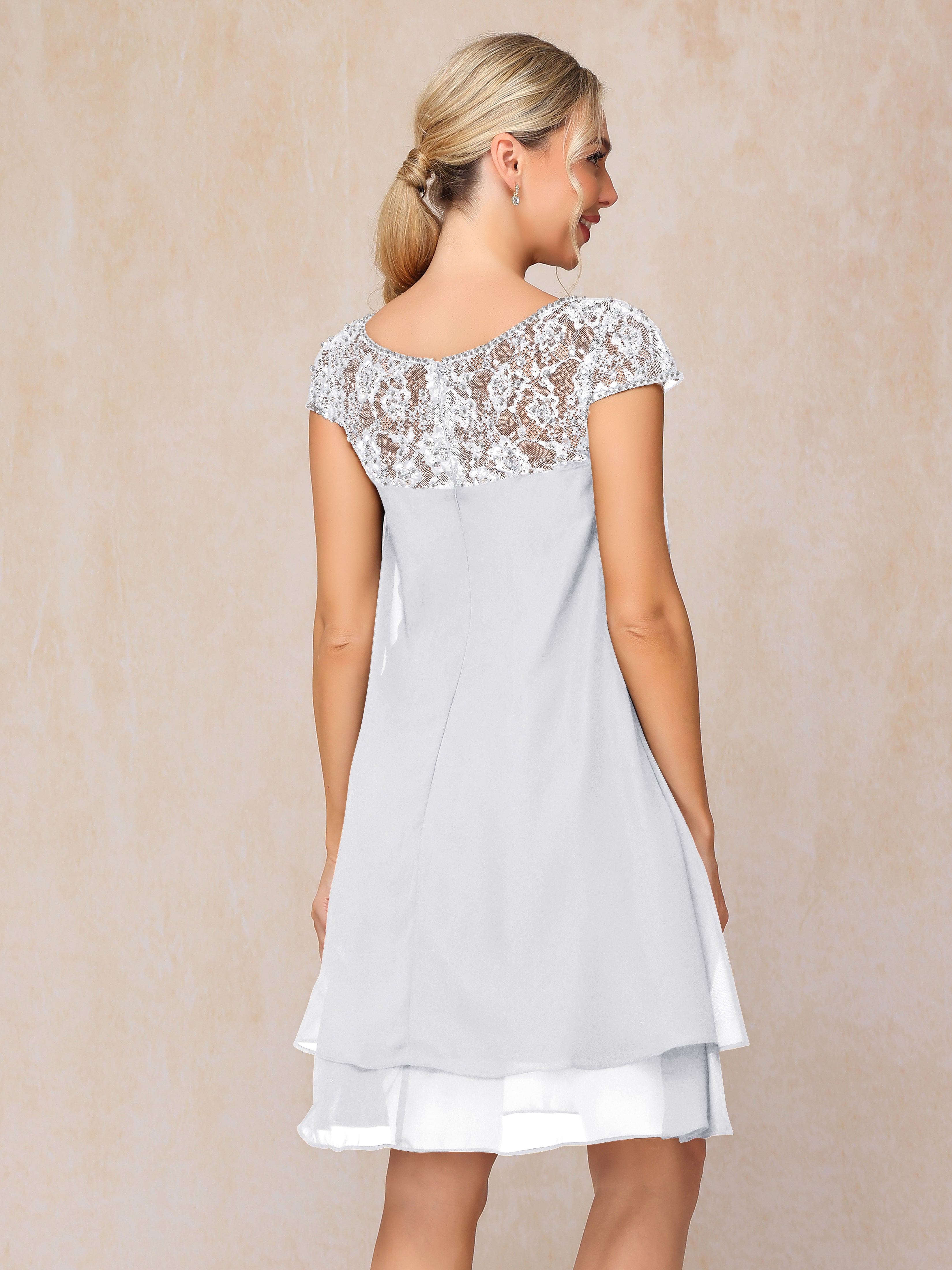 Cap Sleeves Beading Knee Length Chiffon Lace Mother Of The Bride Dress