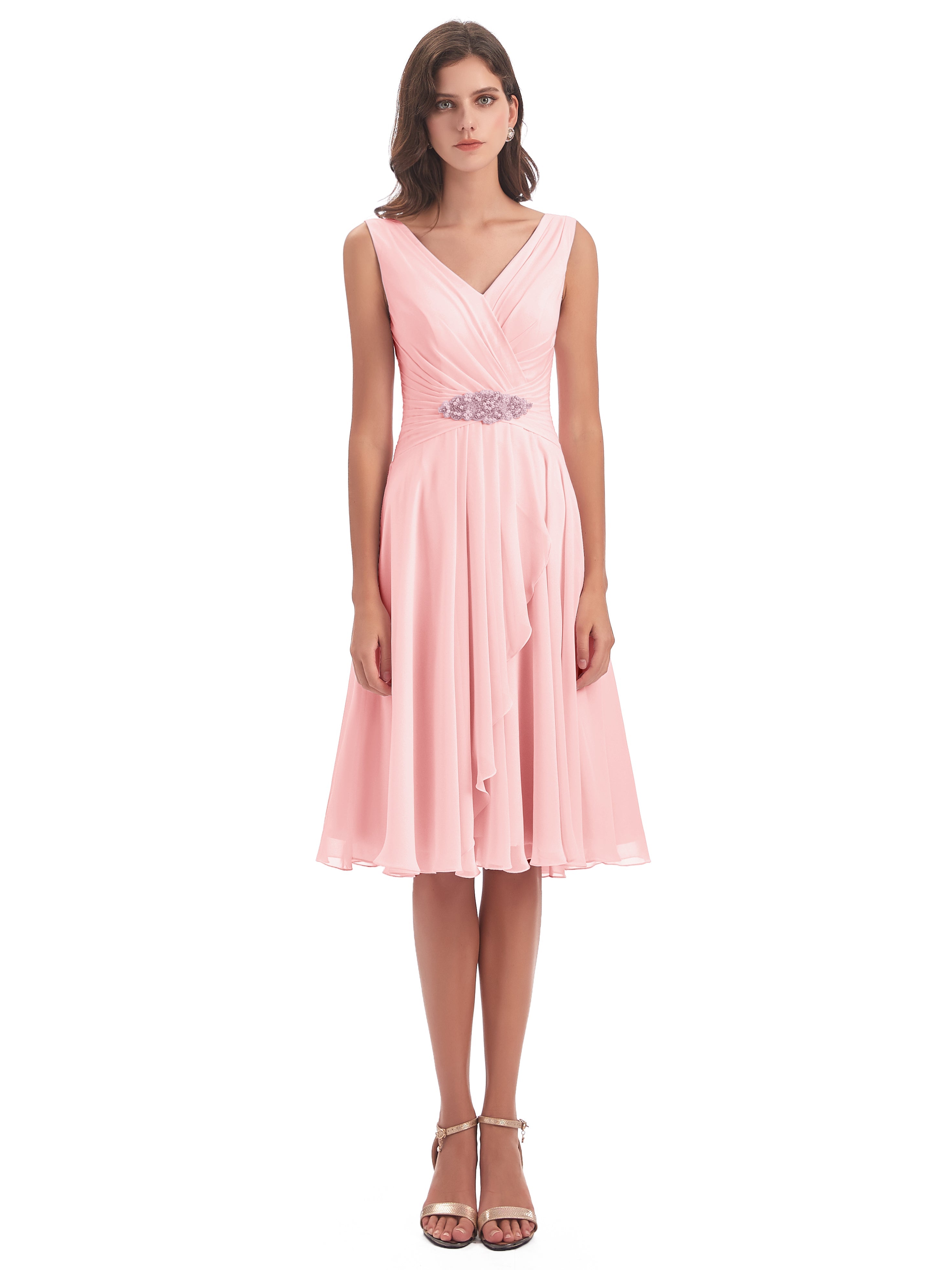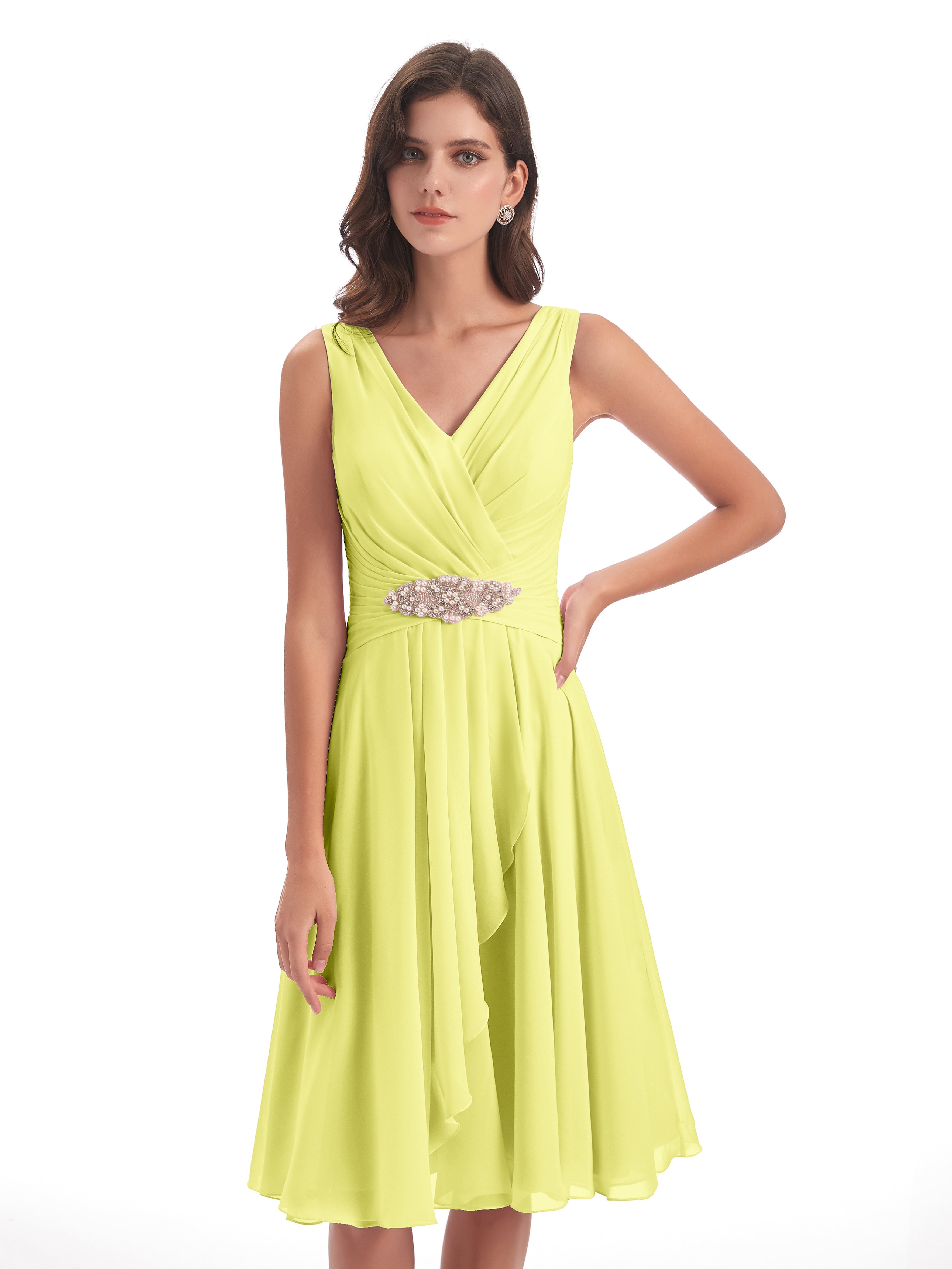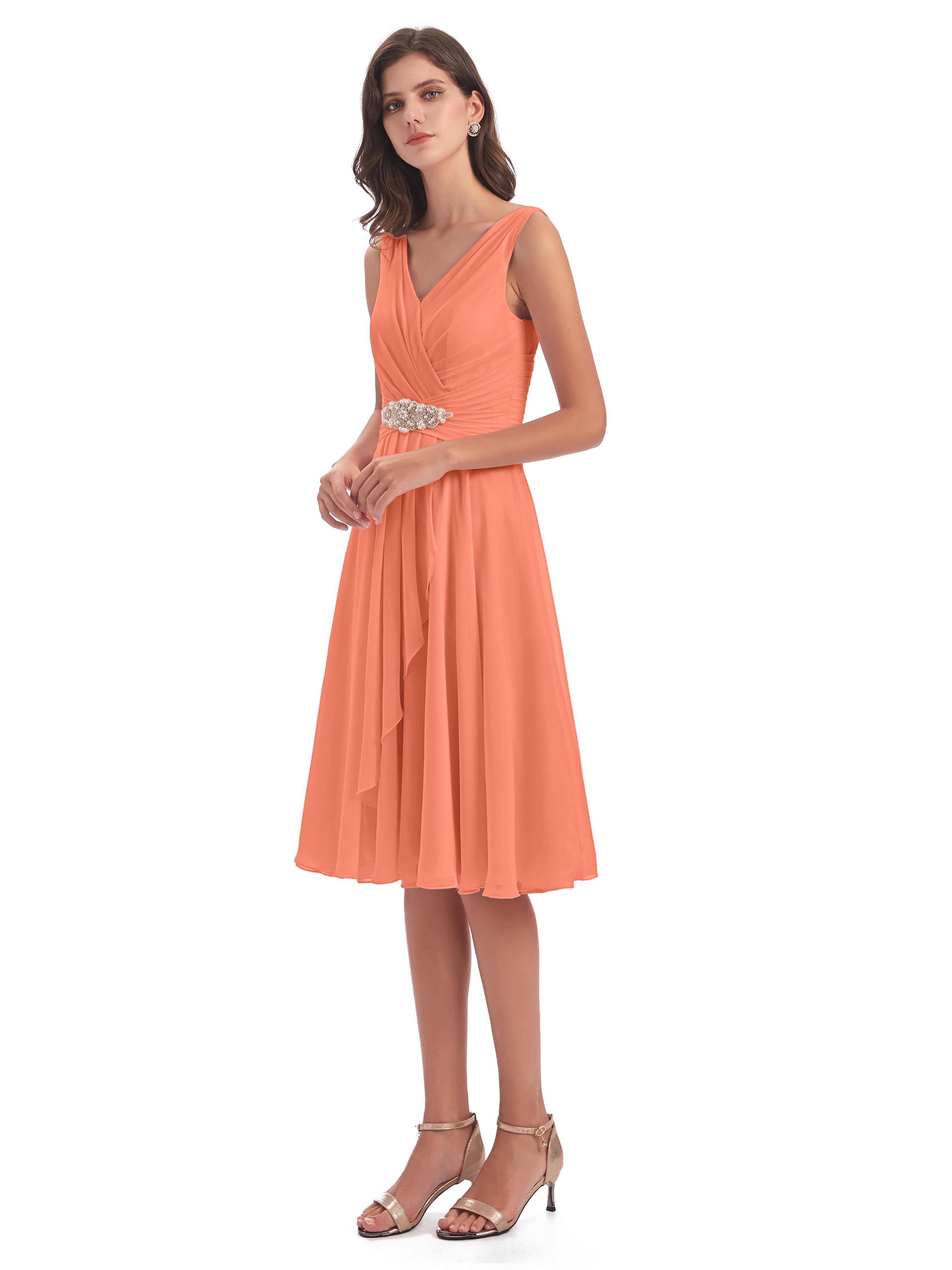 Caylee Knee Length V-neck Asymmetrical Chiffon Bridesmaid Dresses