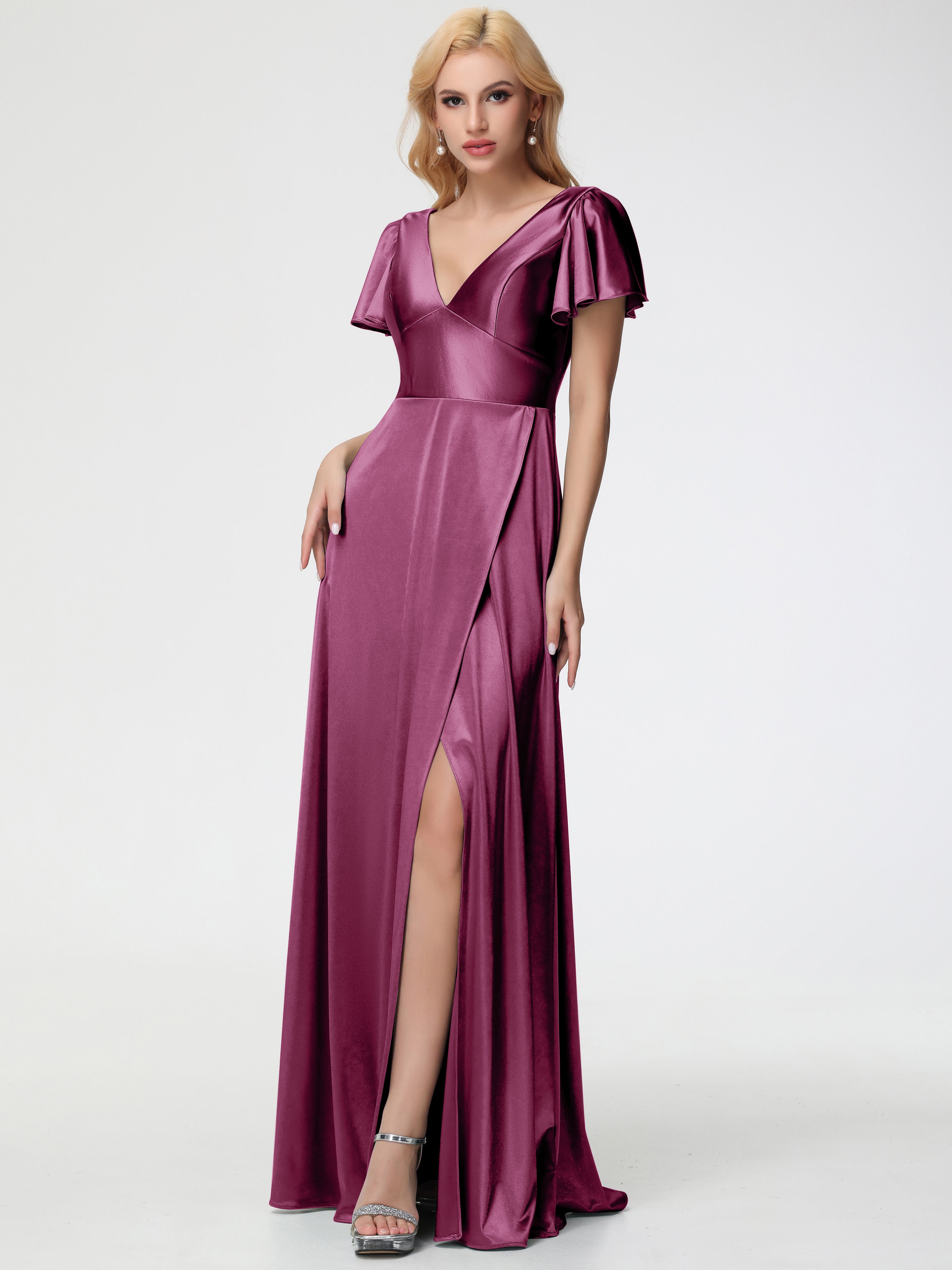 This elegant bridesmaid dress features a deep V-neck, short sleeves, and a split for added comfort and style. Made with stretch satin, it offers a flattering and comfortable fit. Perfect for any wedding or special occasion.