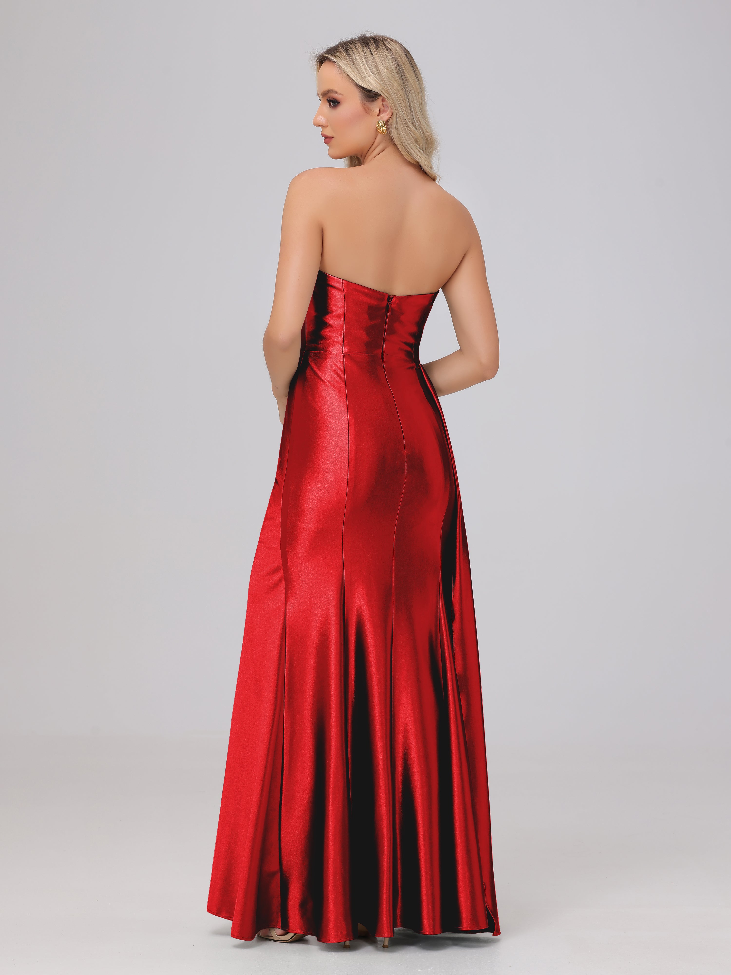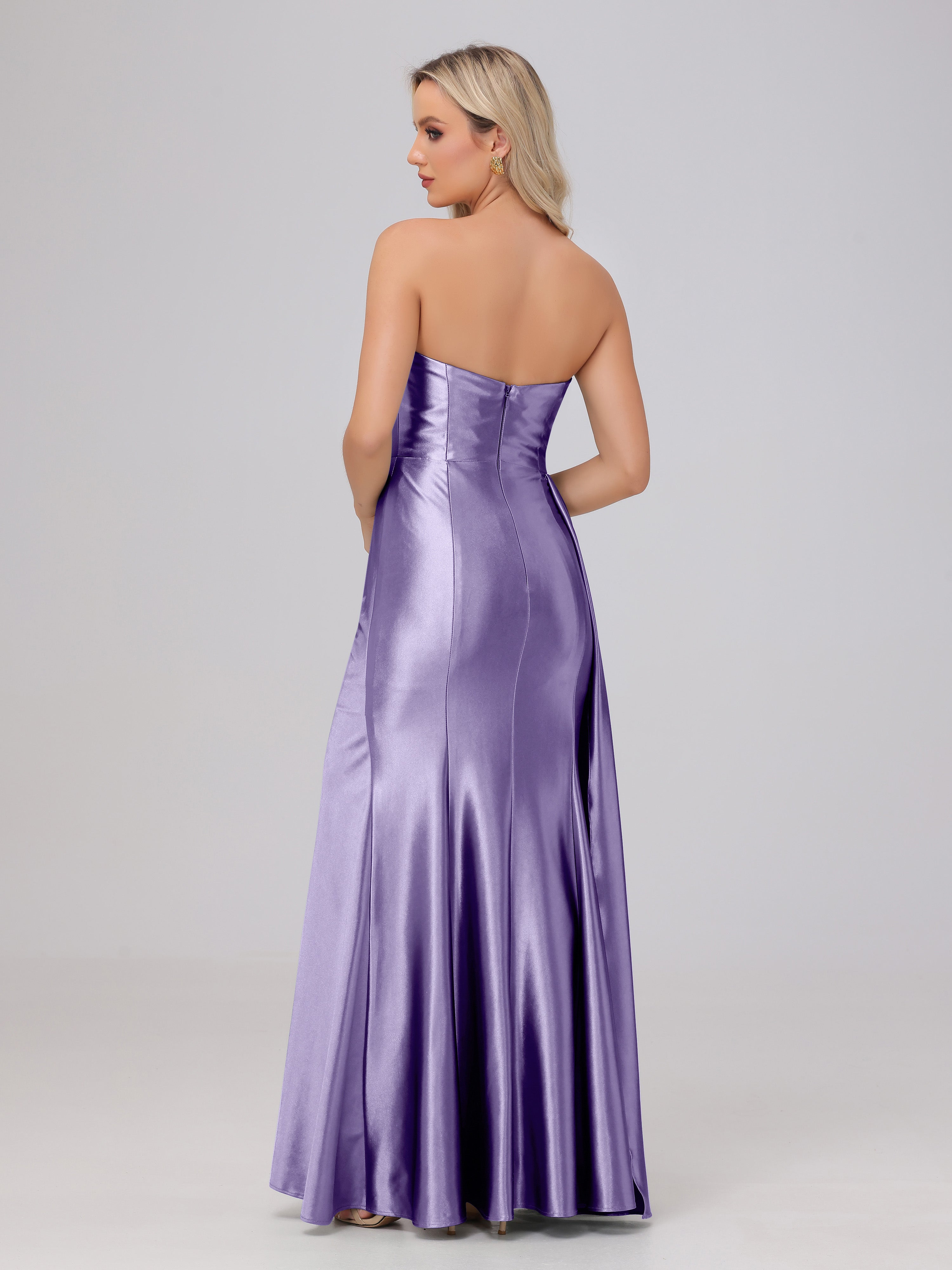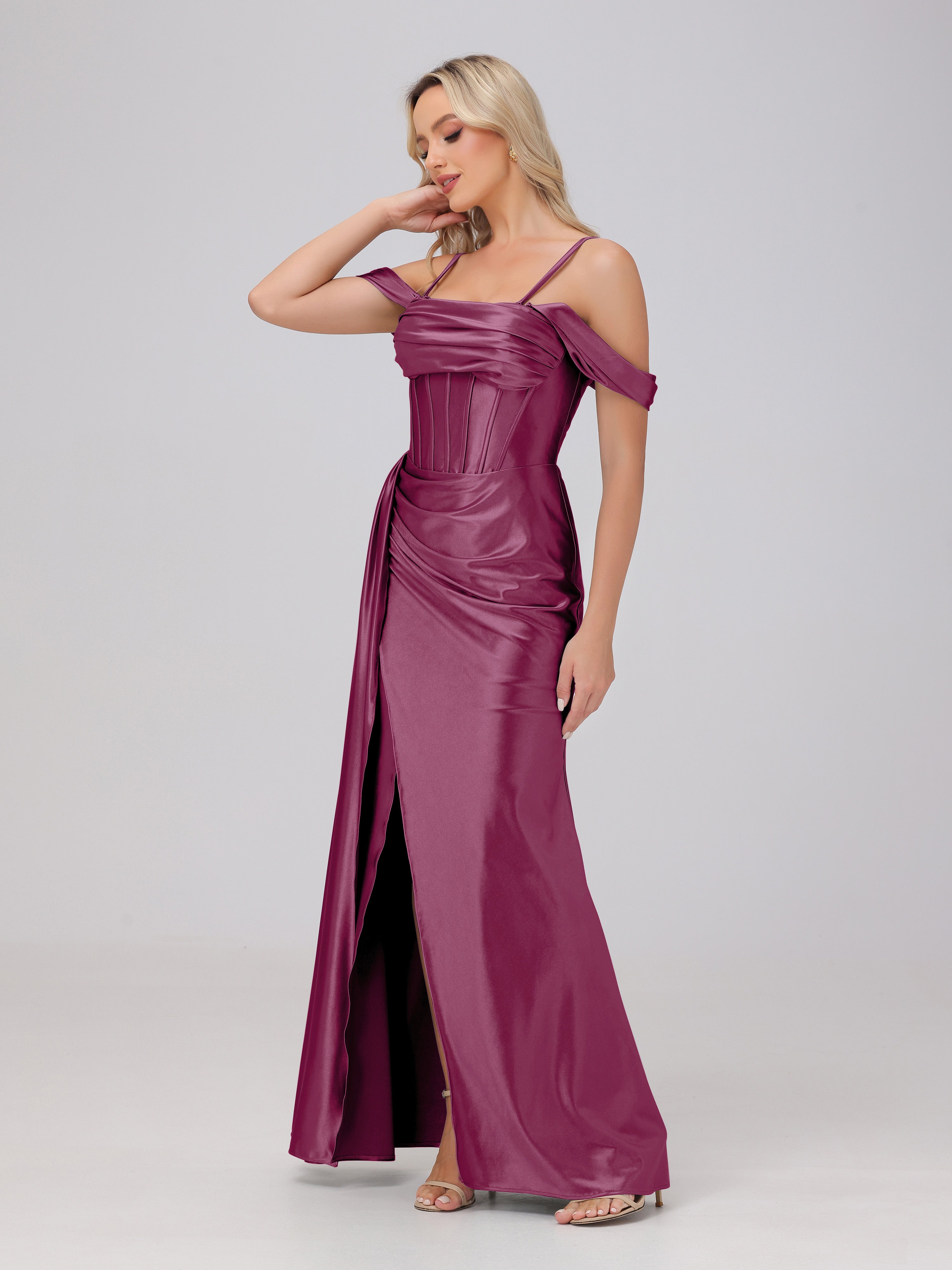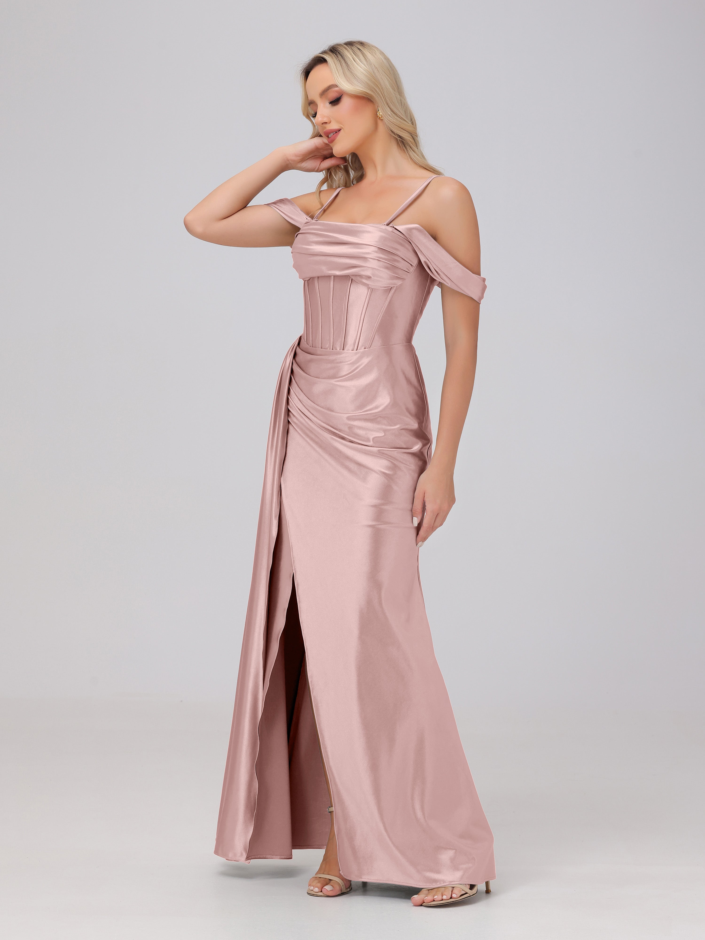 Off the Shoulder Straps Bodice Zip Back Bridesmaid Dresses with Slit