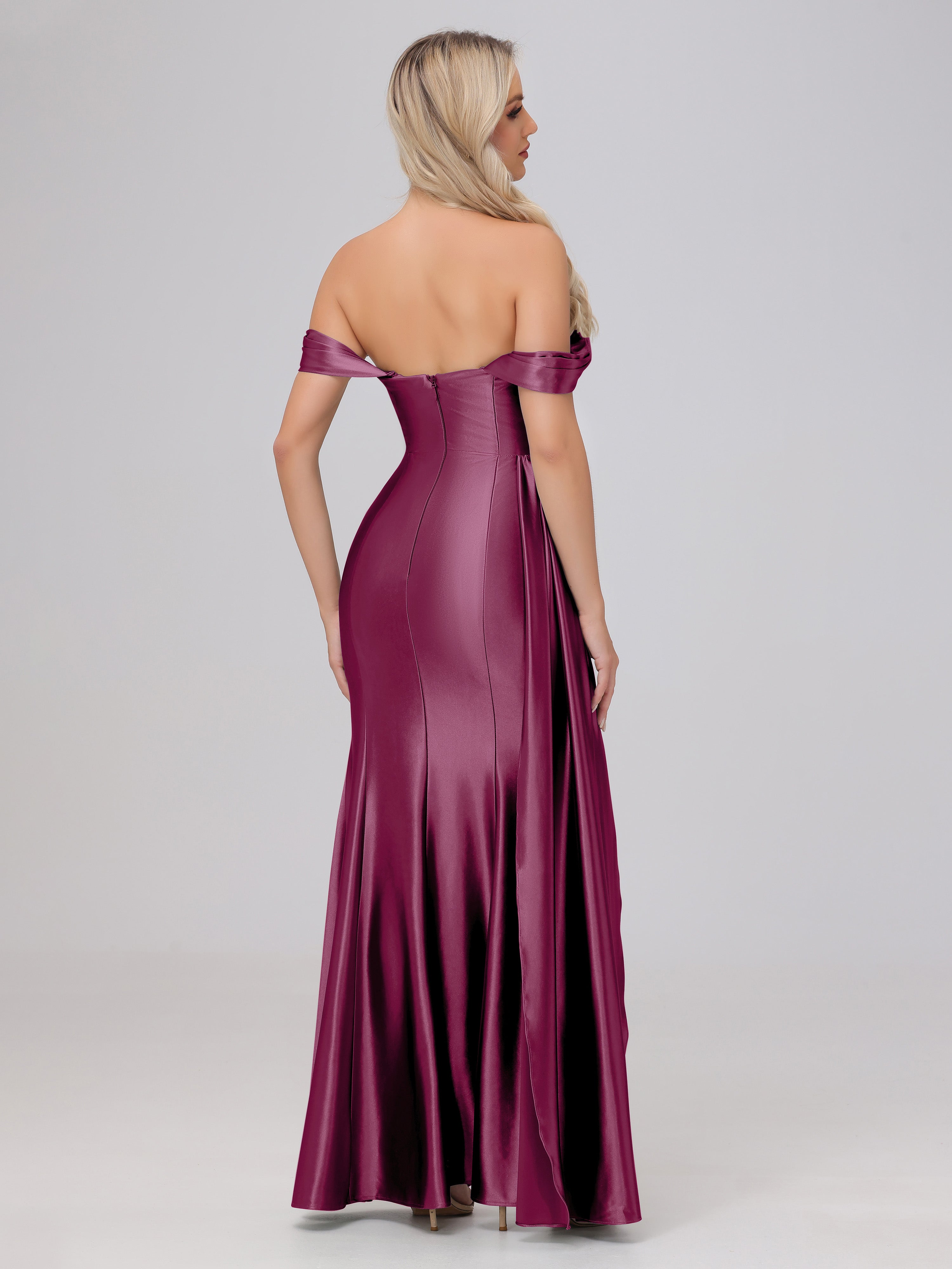 This bridesmaid dress boasts an elegant off the shoulder design, secured with comfortable straps. The bodice features a convenient zip back for a secure fit, while the slit adds a touch of sophistication. Perfect for a stylish and comfortable bridal party.